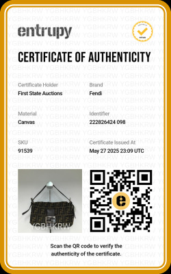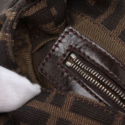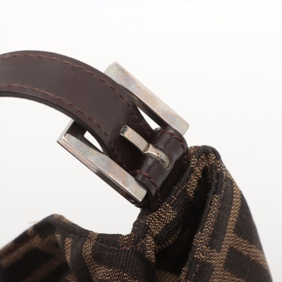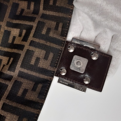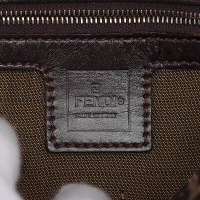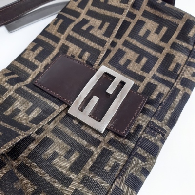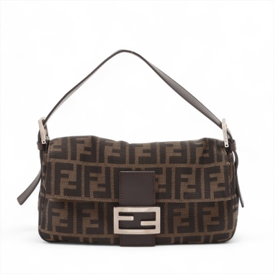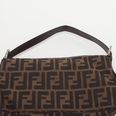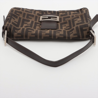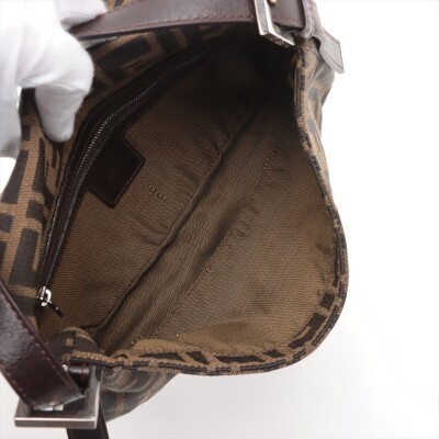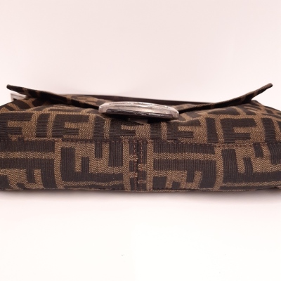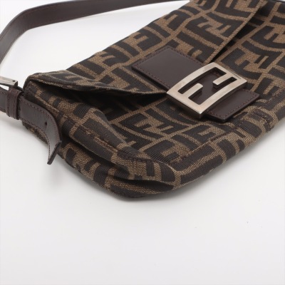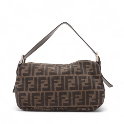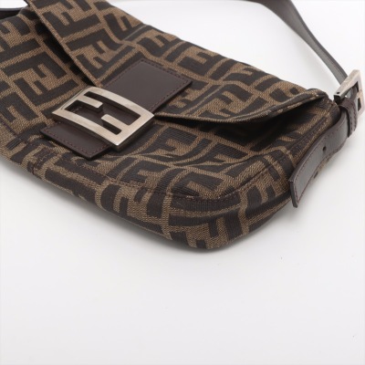 Fendi Baguette shoulder bag in Zucca canvas in brown. Featuring a dark chocolate brown leather looping shoulder strap and facing flap with FF logo detail, silver tone hardware. The magnetic button closure opens to a brown fabric interior with a zipper pocket. Approximate dimensions: 25.5cm(L) x 14cm(H) x 4cm(D), 19cm handle drop. With Entrupy Certificate of Authenticity. (Pre-owned)