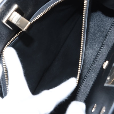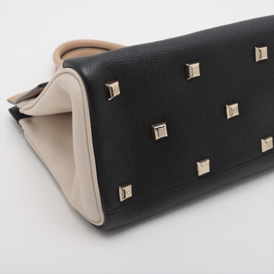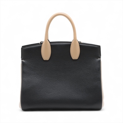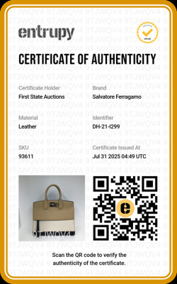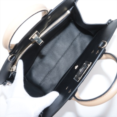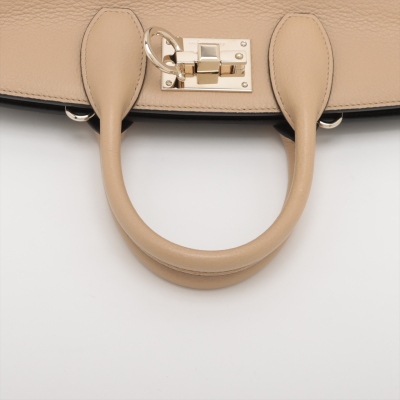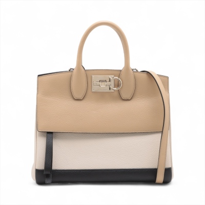 Ferragamo Gancini small Studio tote in tri-colour calfskin. Featuring gold-toned hardware, double rolled handles, exterior front zipper pocket, and turn-lock closure with logo detail. This opens to a black leather interior with zip and patch pockets. Approximate dimensions: 29cm(B-L) x 23cm(H) x 14cm(D), handle drop 9cm, detachable & adjustable shoulder strap drop 51cm. Accompanied by Ferragamo dustbag. With Entrupy Certificate of Authenticity. (Pre-owned)