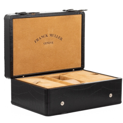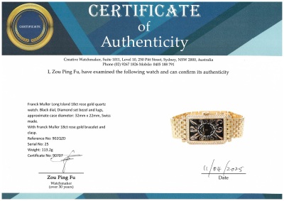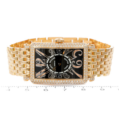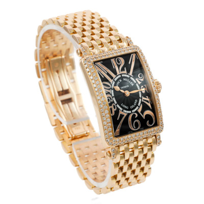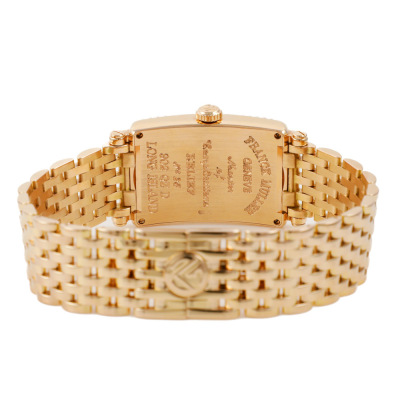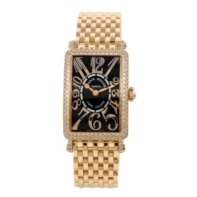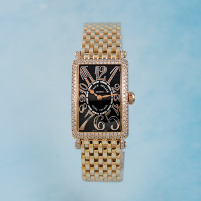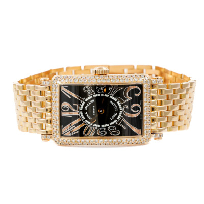 Franck Muller Long Island 18ct rose gold quartz ladies watch. Black dial, Diamond set bezel and lugs, approximate case diameter: 32mm x 22mm, wrist size: 17.5cm, Swiss made. Ref# 902QZD. With Franck Muller 18ct rose gold bracelet and clasp. With Certificate of Authenticity, Franck Muller Certificate of Origin and Guarantee dated 13/09/2007 and Franck Muller box. 3 month FSA warranty (Pre-owned)