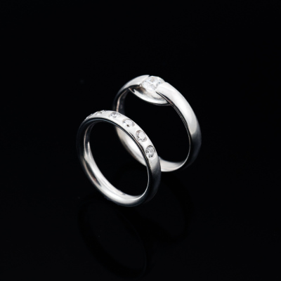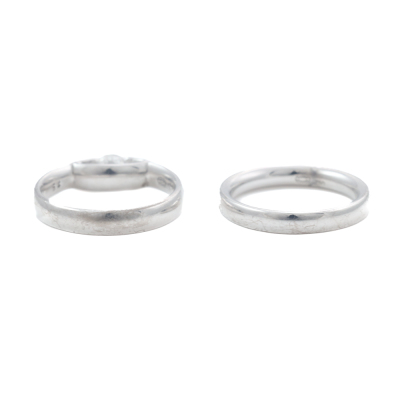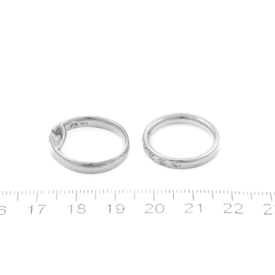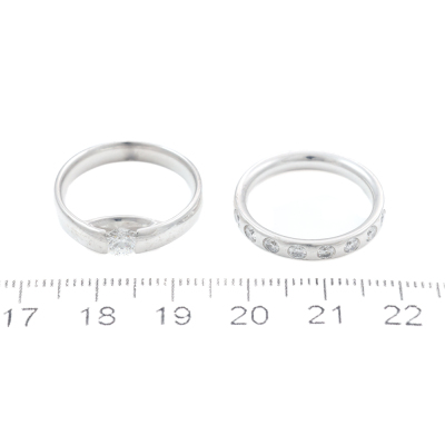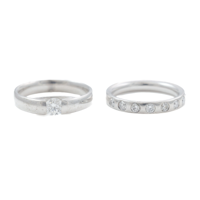 George Jensen ring set. 1) Georg Jensen Centenary Diamond ring with round Natural Diamond of 0.40ct (With GIA Report graded as: F VVS2 #17097280). 18ct white gold. Georg Jensen stamped ring size: 54, M - ring resizing is not recommended. Band width: 3.5mm. 2) George Jensen Magic ring with 9 round Natural Diamonds totalling 0.18ct. 18ct white gold. Ring size: M - ring resizing is not recommended. Band width: 3.1mm. Combined weight: 9.7g. (Pre-owned)