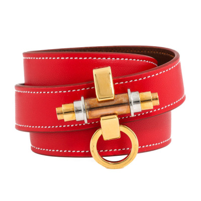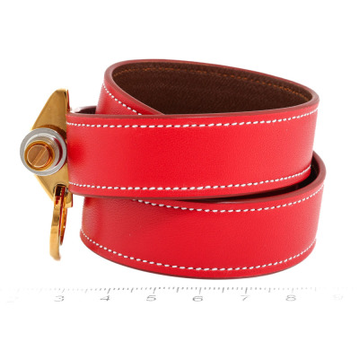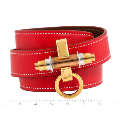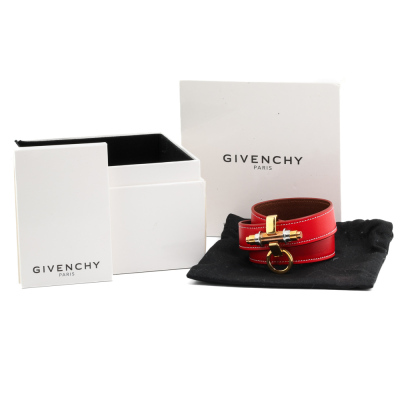 Givenchy Obsedia 3 Row Leather Red Cuff. Yellow gold plated steel. Stamped size: S. Width: 1.8cm. Made in Italy. Weight: 40.7g. With Givenchy box & pouch. (Pre-owned)*