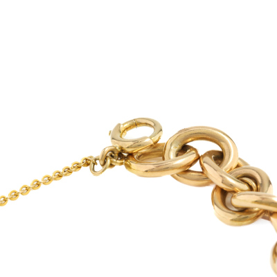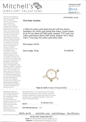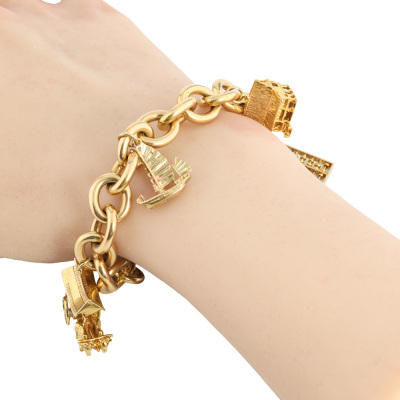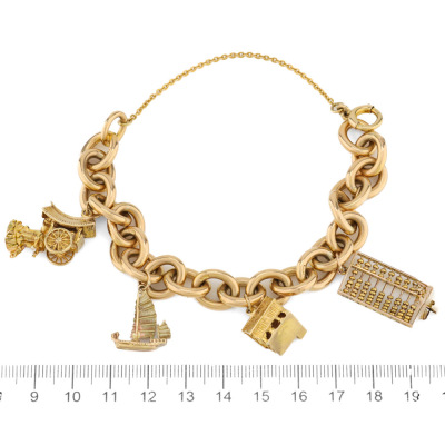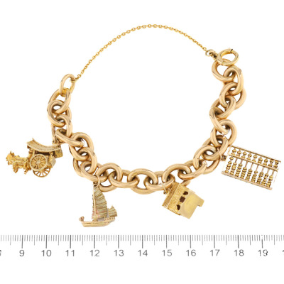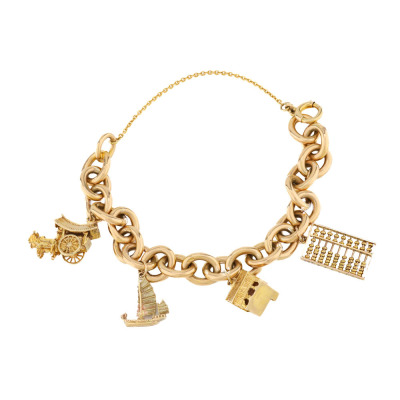 Cable chain gold bracelet with 4 charms. 9ct yellow gold chain & clasp. 9ct yellow gold of a sailing boat charm, a house charm & an Ox cart charm (all XRF tested, stamped '375') and 6ct yellow gold abacus charm (XRF tested, stamped '9ct'). 18ct yellow gold safety chain of 7.5cm. Length: 20cm. Weight: 56g. With Valuation Certificate #421781. (Pre-owned)