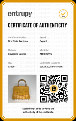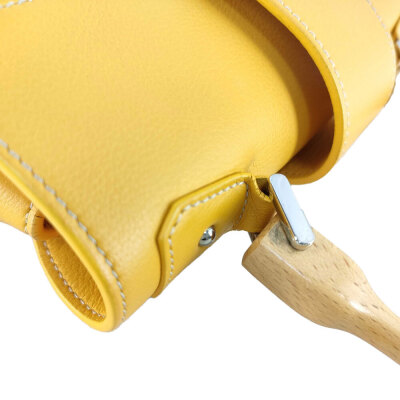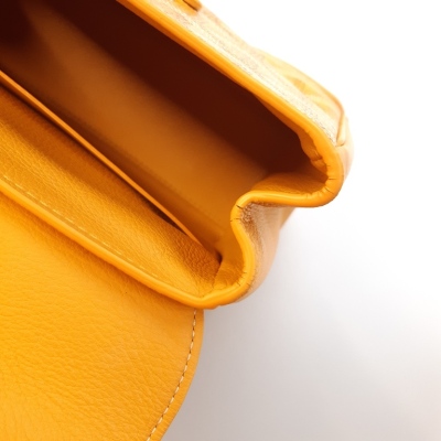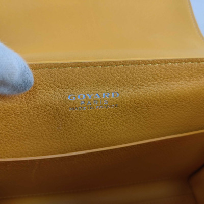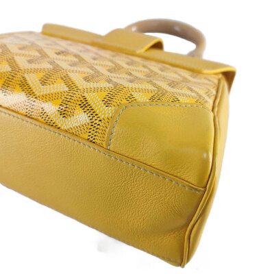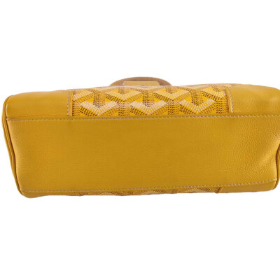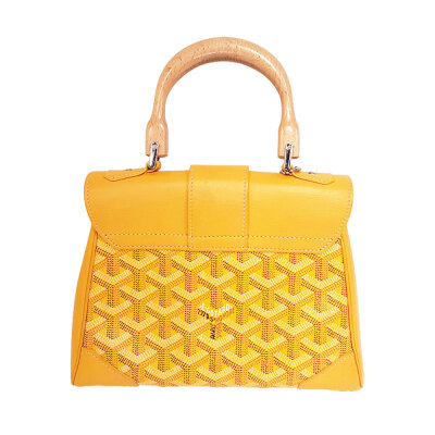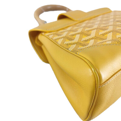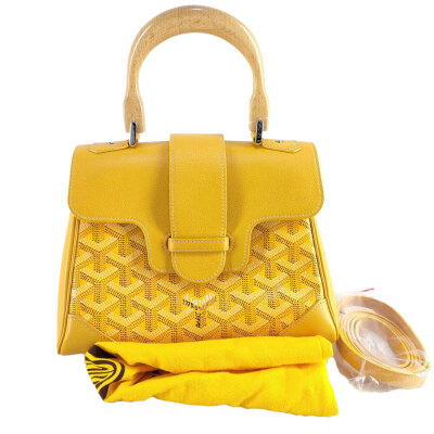 Goyard Saigon Souple mini bag in yellow Goyardine coated canvas and yellow calfskin leather. Featuring silver-toned hardware, single wooden top handle, and detachable shoulder strap. The flap with sliding belt closure opens to a yellow leather interior with a patch pocket. Approximate dimensions: 20cm(L) x 15cm(H) x 7.5cm(D), handle drop 7cm, strap max drop 56cm. Accompanied by Goyard dustbag. With Entrupy Certificate of Authenticity. (Pre-owned)