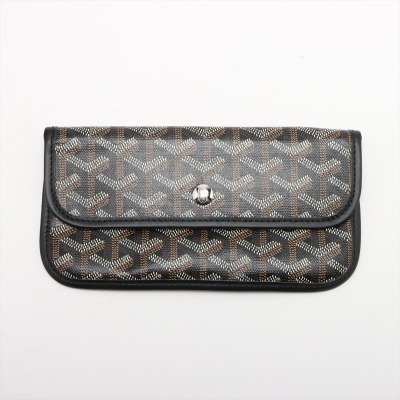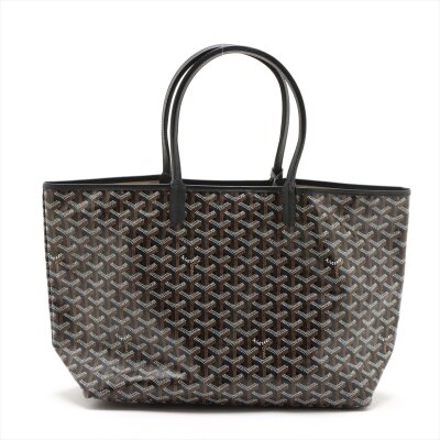 Goyard Saint Louis PM tote in black Goyardine pattern print canvas with black leather trim (circa: 2020). Featuring dual flat leather top handles, black stitching, and a matching pouch with button closure. The top opens to a beige textile interior. Approximate dimensions: 33.5cm(base-W) x 25.5cm(H) x 14cm(D), handle drop 17.5cm. Accompanied by a Goyard detachable pouch. With Entrupy Certificate of Authenticity.