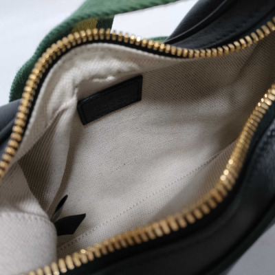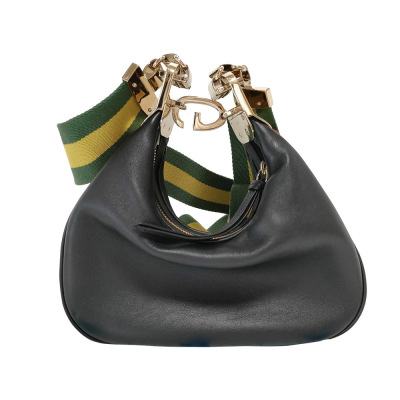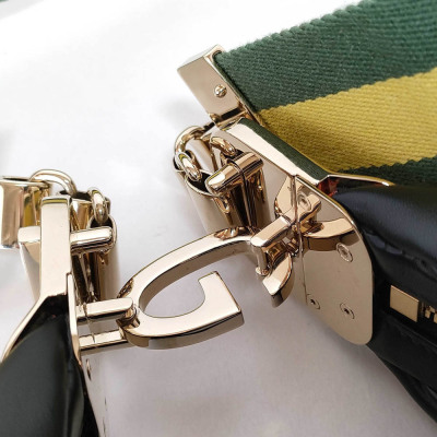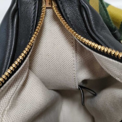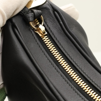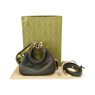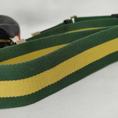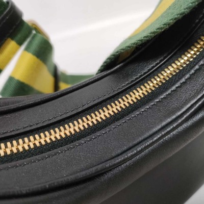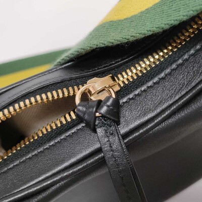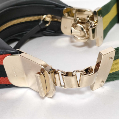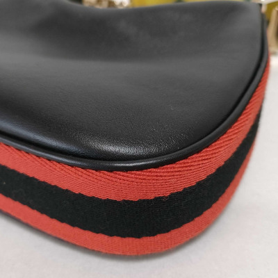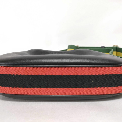 Gucci Attache small shoulder bag in black calfskin with black & red web stripe along bottom. Featuring light-gold toned hardware, G-shaped hook on sides, a detachable green & yellow web shoulder strap and an additional leather strap. The top with zipper closure opens up to a light beige fabric interior. Approximate dimensions: 23cm(Base-L) x 13cm(H) x 5m(D), a 65cm web strap drop and a 50cm leather strap drop, both adjustable. Accompanied by a Gucci leather strap, set of spare buttons, dustbag and box. With Entrupy Certificate of Authenticity. (Pre-owned)