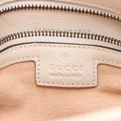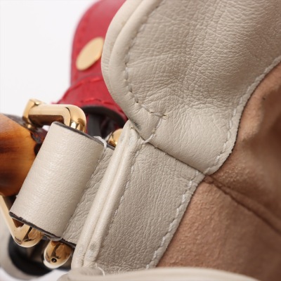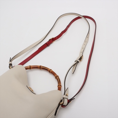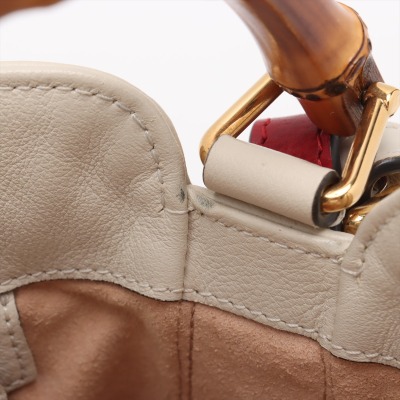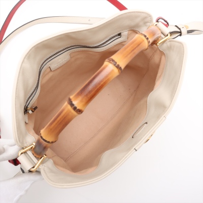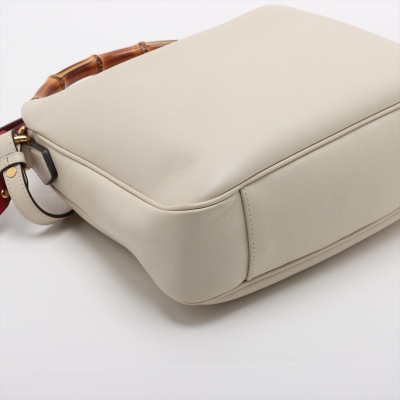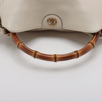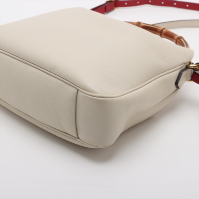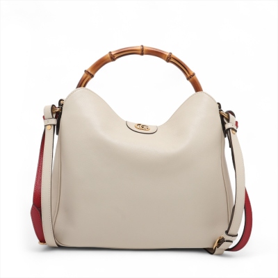 Gucci Diana medium shoulder bag in Ivory calfskin leather. Featuring single bamboo handle, aged gold-toned hardware, top folding flaps with GG logo & magnetic closure. This opens to a beige microfibre lining interior with a zipped pocket. Approx dimensions: 30cm(L) x 24cm(H) x 7cm(D), 16cm handle drop, dual detachable & adjustable leather straps (Ivory & Red) drop: 55cm. Accompanied by Gucci dust bag. With Entrupy Certificate of Authenticity. (Pre-owned)