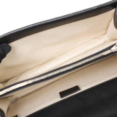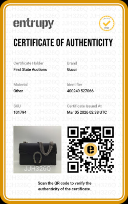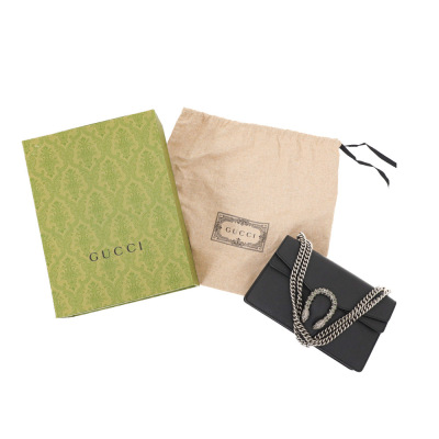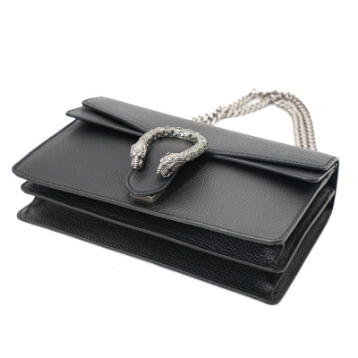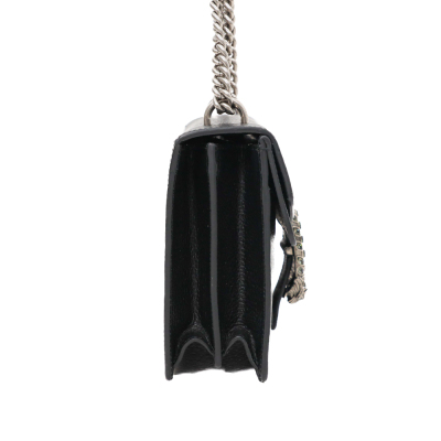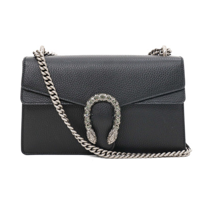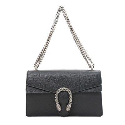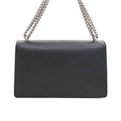 Gucci Dionysus chain shoulder bag in black grained calfskin leather. Featuring matte silver-toned hardware, chain link strap and a frontal flap with an embellished textured horseshoe tiger spur detailed push-lock closure. This opens to a front patch pocket and a beige textile lining interior with 2 compartments divided by a zippered pocket. Approximate dimensions: 28cm(W) x 17cm(H) x 6cm(D), with a 21cm double chain drop. Accompanied by Gucci care cards, dustbag and box. With Entrupy Certificate of Authenticity.