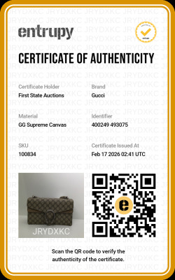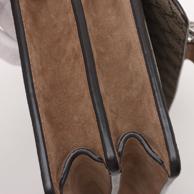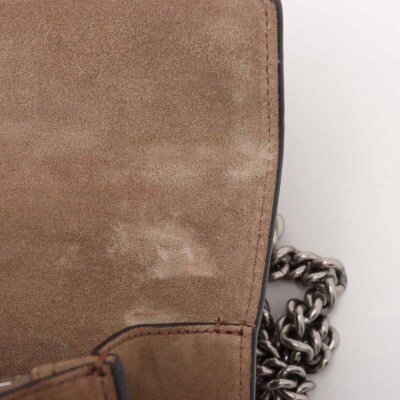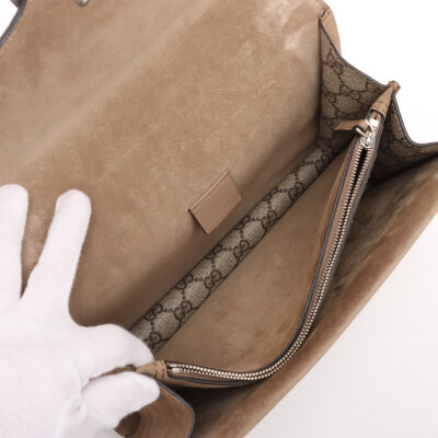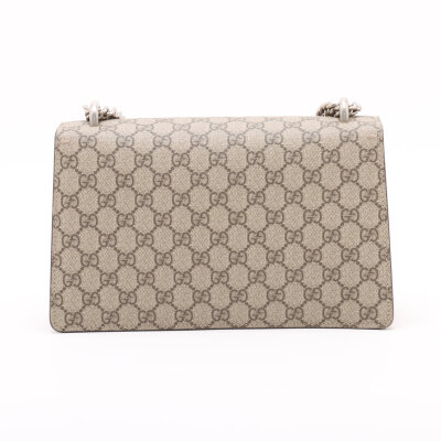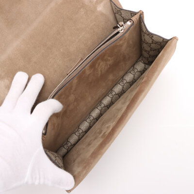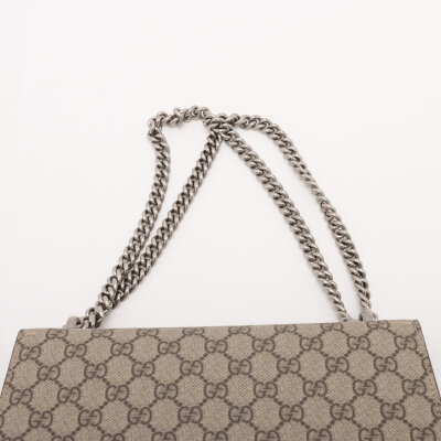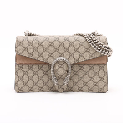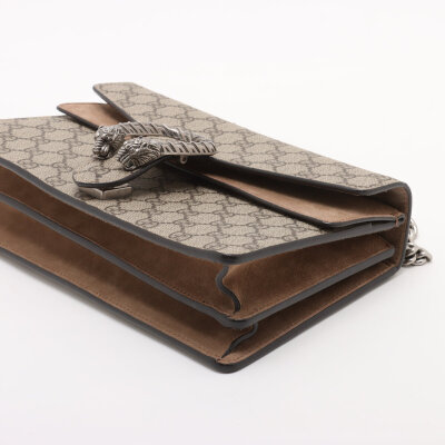Gucci medium Dionysus shoulder bag in GG Supreme canvas with taupe suede detail. Featuring matte silver-toned hardware, sliding chain link strap, and a textured horseshoe tiger spur detailed push-lock closure. The dual flaps open to an exterior flat pocket, and suede lining interior with two compartments divided by a centre zippered pocket. Approximate dimensions: 28cm(base-W) x 16cm(H) x 7cm(D), with a 37cm single chain drop. With Entrupy Certificate of Authenticity.