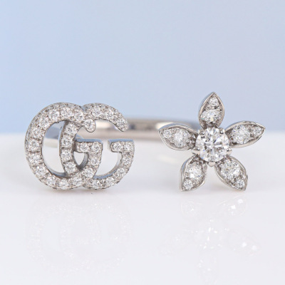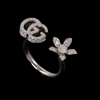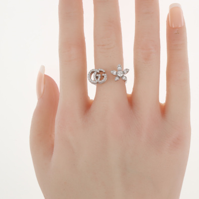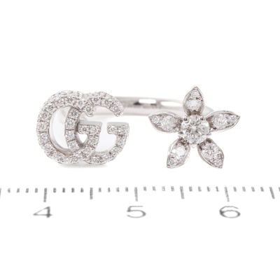 Gucci Flora GG open ring with round Natural Diamonds totalling 0.55ct (Estimated grading: F-G VS). 18ct white gold. Made in Italy. Gucci stamped size 11, measures as size J - ring resizing is not recommended. Band width: 2.4mm - 1.7mm. Weight: 4.9g. (Pre-owned)