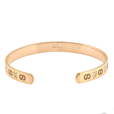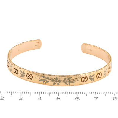 Gucci GG Running Cuff bracelet with 2 double G logos & blossom enamel. 18ct rose gold. Stamped size 18. Measured internal circumference: 16.5cm. Made in Italy. Weight: 16.9g. With Gucci box & pouch. (Pre-owned)