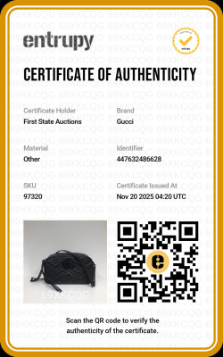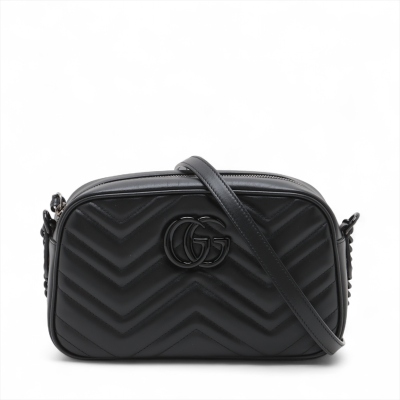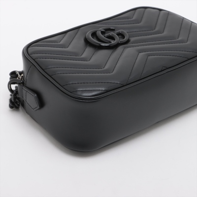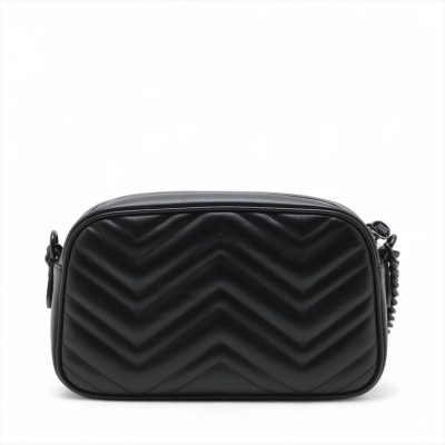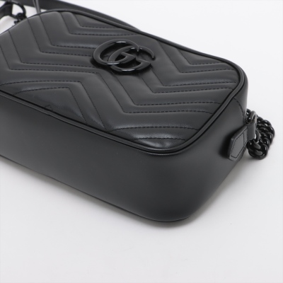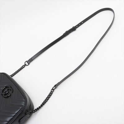 Gucci GG Marmont All Black crossbody bag in black chevron quilted leather. Featuring black and silver tone hardware, double G hardware logo at front, and adjustable leather-chain shoulder strap. The zipper top opens to black textile lining interior with a patch pocket. Approximate dimensions: 24cm(L) x 13cm(H) x 7cm(D), 62cm shoulder drop height. Accompanied by Gucci information booklet, dustbag & box. With Entrupy Certificate of Authenticity. (Pre-owned)