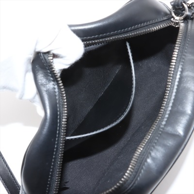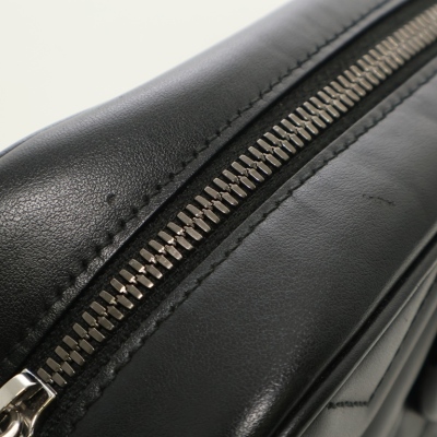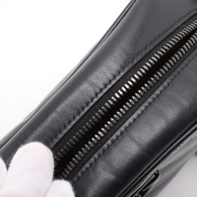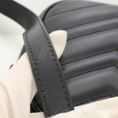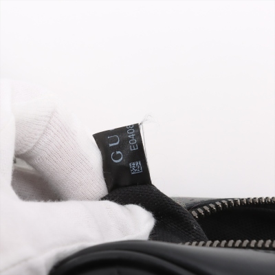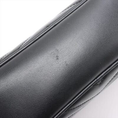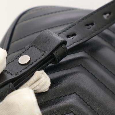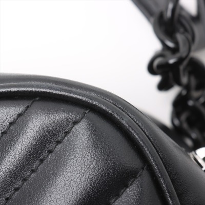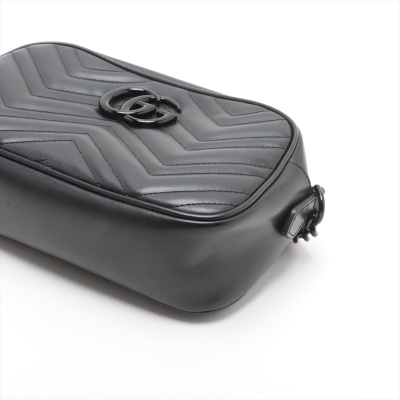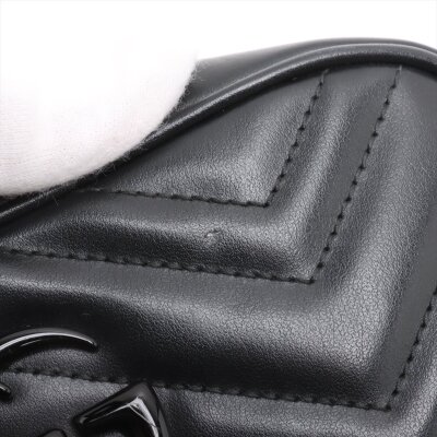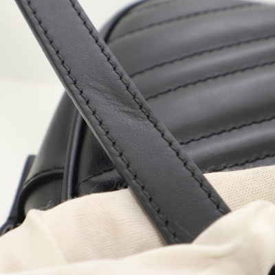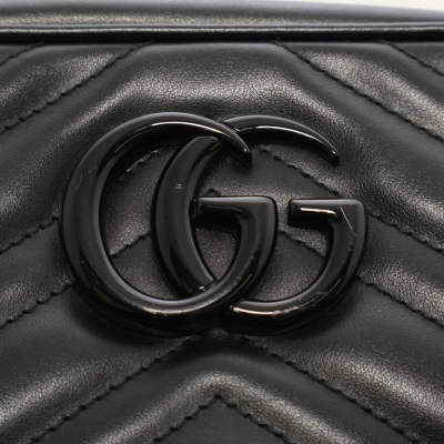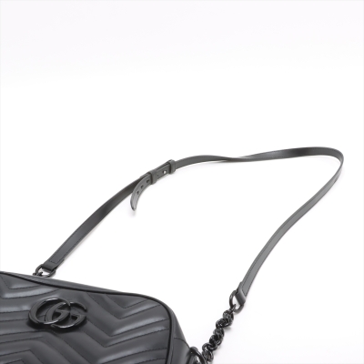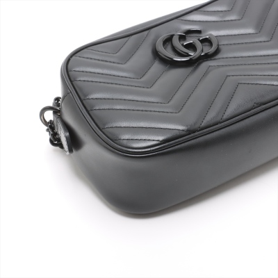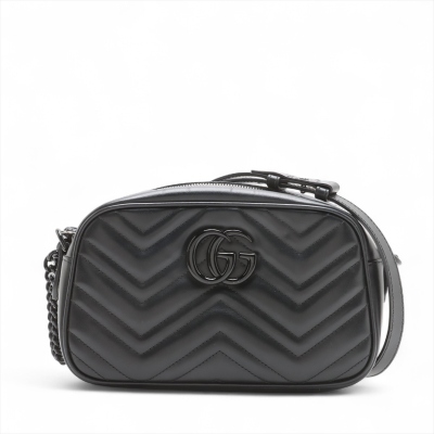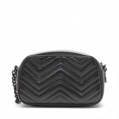 Gucci GG Marmont crossbody bag in black chevron quilted leather. Featuring black-toned hardware, GG hardware logo at front, and adjustable leather-chain shoulder strap. The zipper top opens to a black fabric interior with a patch pocket. Approximate dimensions: 24cm(base-W) x 14cm(H) x 6.5cm(D), and a 60cm shoulder drop height. Accompanied by a Gucci dustbag and box. With Entrupy Certificate of Authenticity.