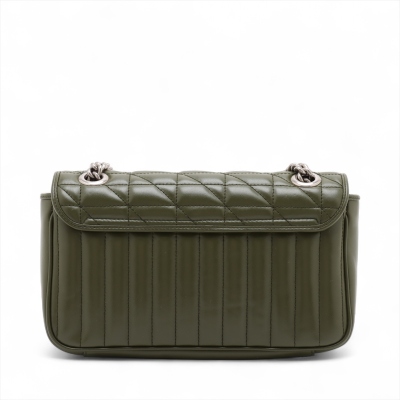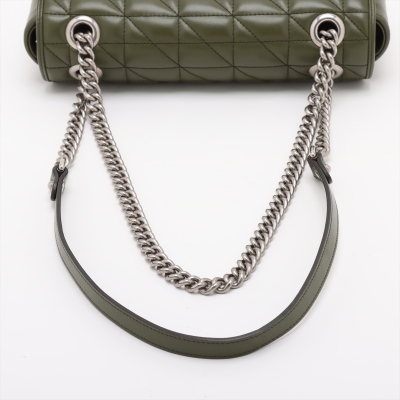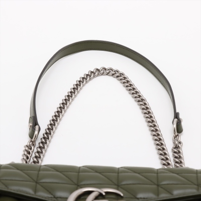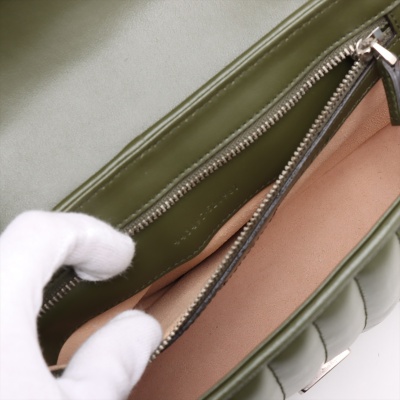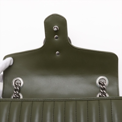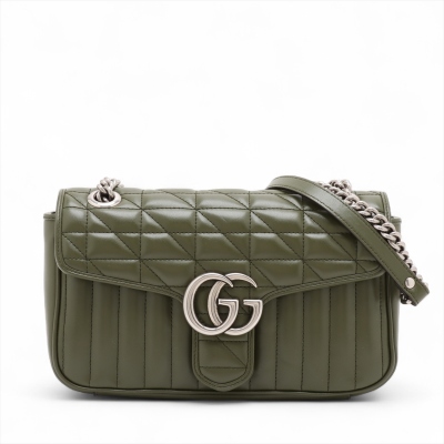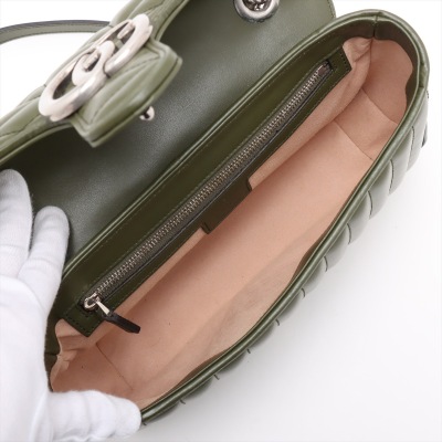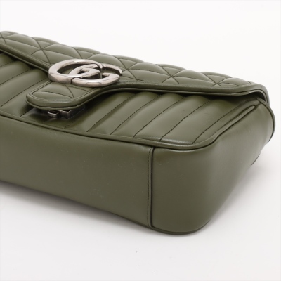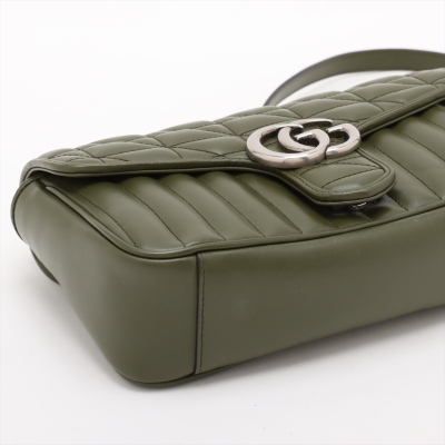 Gucci GG Marmont flap shoulder bag in forest green quilted leather. Featuring antique silver-toned hardware, double GG hardware logo at front, and sliding leather-chain shoulder strap. The push-lock flap opens to a beige microfibre interior with a zippered pocket. Approximate dimensions: 25cm(L) x 15cm(H) x 7cm(D), with a 53cm strap drop. Accompanied by a Gucci dustbag. With Entrupy Certificate of Authenticity.