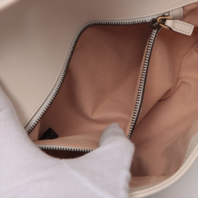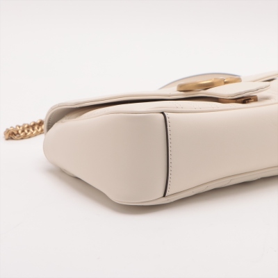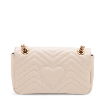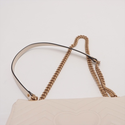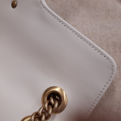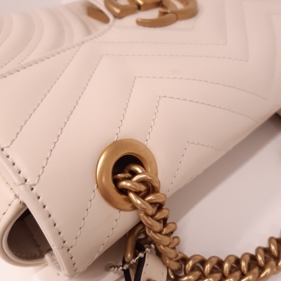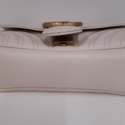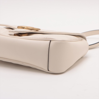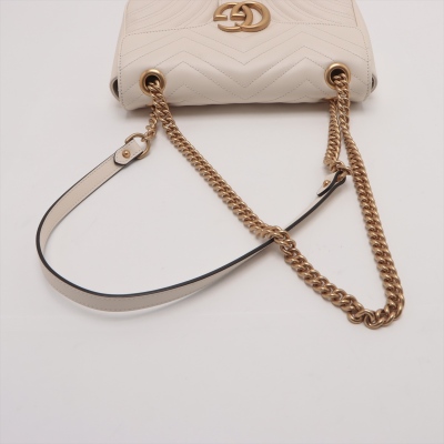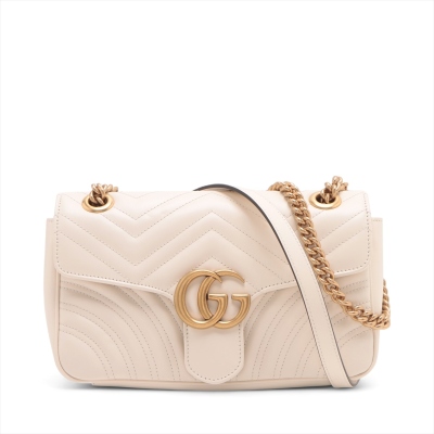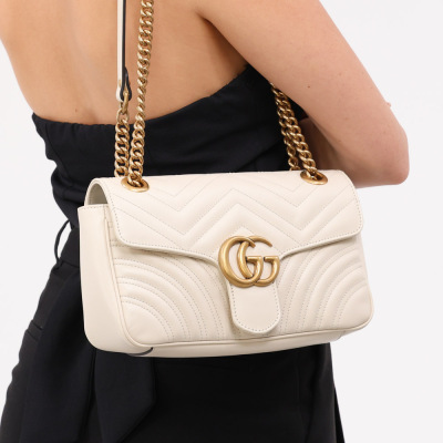 Gucci GG Marmont flap shoulder bag in white chevron quilted leather. Featuring antique gold-toned hardware, double GG hardware logo at front, and sliding leather-chain shoulder strap. The flap opens to a beige microfibre interior with a zipper pocket. Approximate dimensions: 25cm(L) x 15cm(H) x 7cm(D), strap drop 52.5cm. Accompanied by Gucci dustbag. With Entrupy Certificate of Authenticity. (Pre-owned)