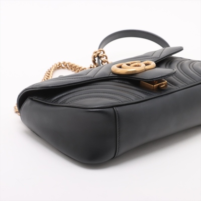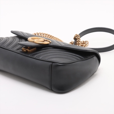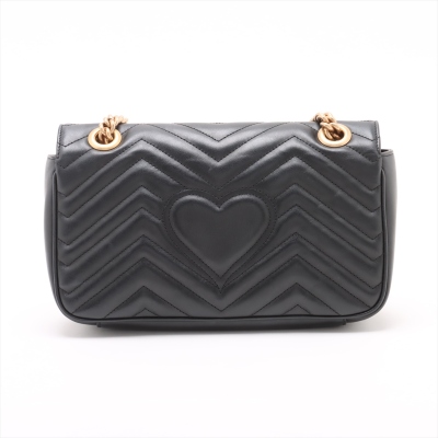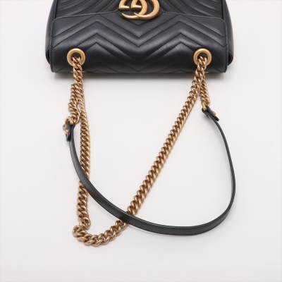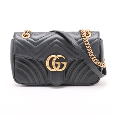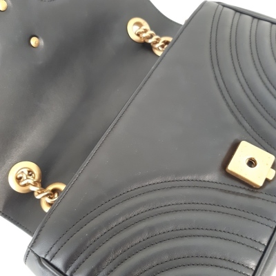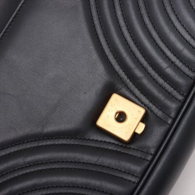 Gucci GG Marmont flap shoulder bag in black chevron quilted leather. Featuring aged gold-toned hardware, double GG logo at front flap and a sliding chain shoulder strap with a leather shoulder pad. The push-lock closure opens to a beige microfibre interior with a zip pocket. Approximate dimensions: 26cm(L) x 16cm(H) x 7cm(D), single shoulder chain drop 55cm. With Entrupy Certificate of Authenticity. (Pre-owned).