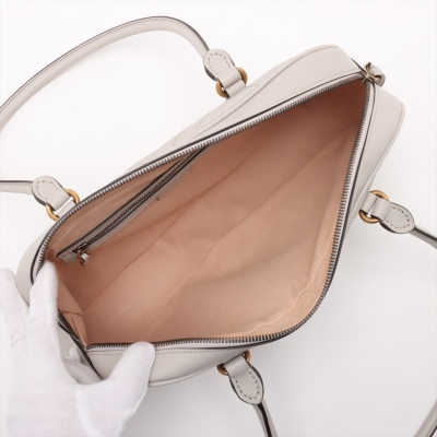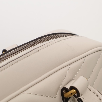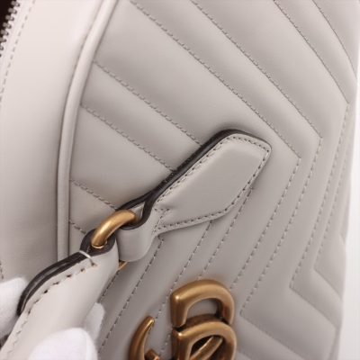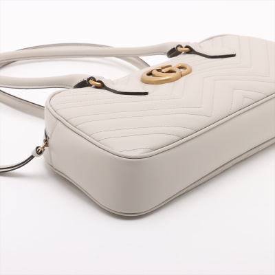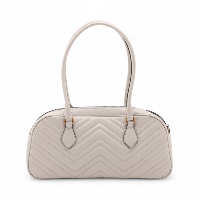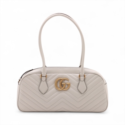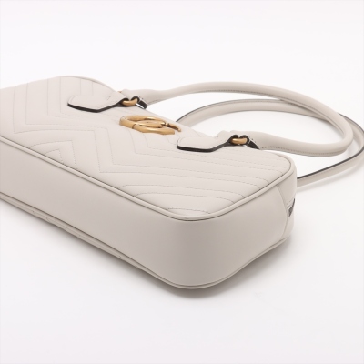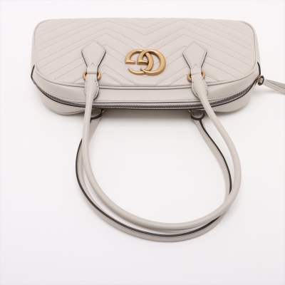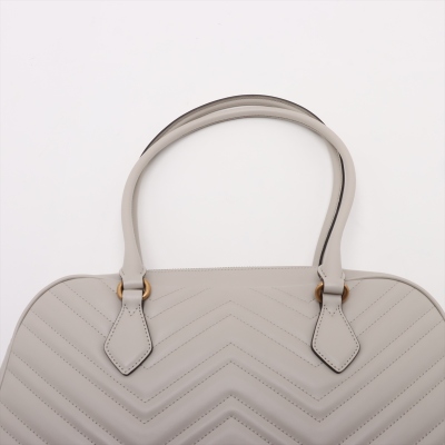 Gucci GG Marmont top handle bag in grey chevron quilted leather. Featuring antique gold-toned hardware, double G hardware logo at front, tall rolled top handles, and a zippered closure. This opens to a beige microfibre lined interior with a zippered pocket. Approximate dimensions: 35cm(W) x 15cm(H) x 6cm(D), with a 20cm shoulder drop. Accompanied by a Gucci RFID authenticity card, care card, and dustbag. With Entrupy Certificate of Authenticity.