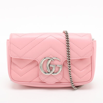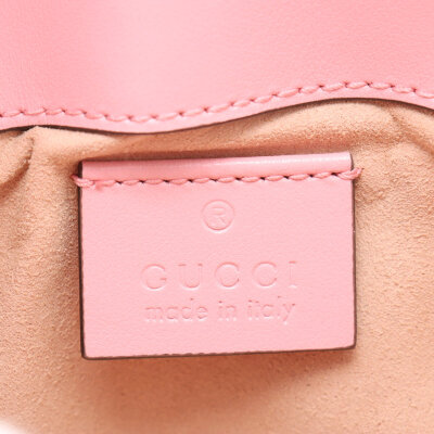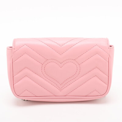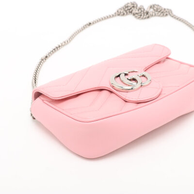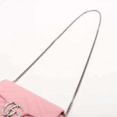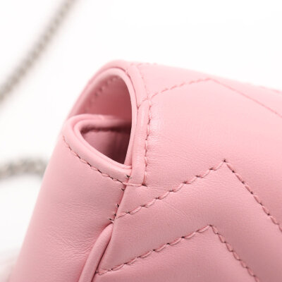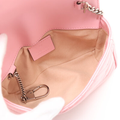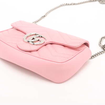 Gucci GG Marmont mini chain bag in pink chevron quilted leather. Featuring silver-toned hardware, GG hardware logo at front, heart quilted feature on the back, and a detachable chain link strap. The snap button closure on flap opens to a beige microfibre interior. Approximate dimensions: 16.5cm(W) x 10cm(H) x 5cm(D), with a 30cm strap drop. Accompanied by a Gucci dustbag. With Entrupy Certificate of Authenticity.