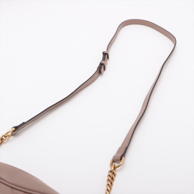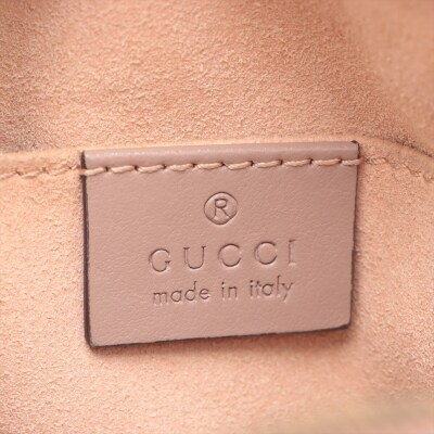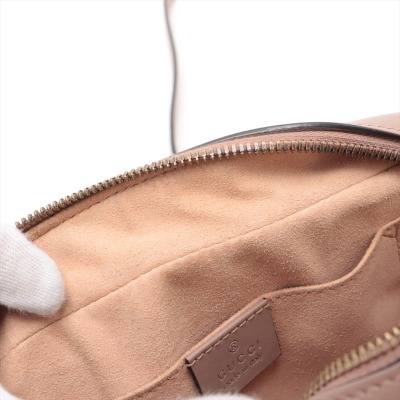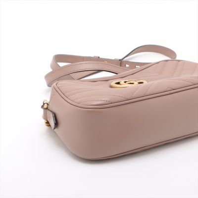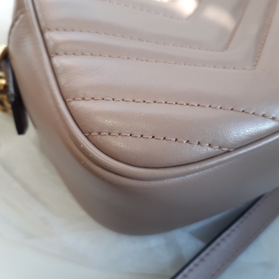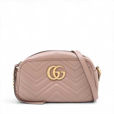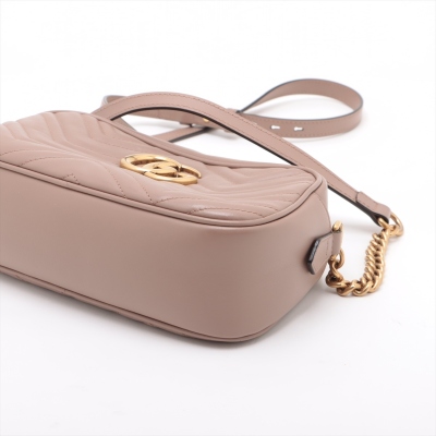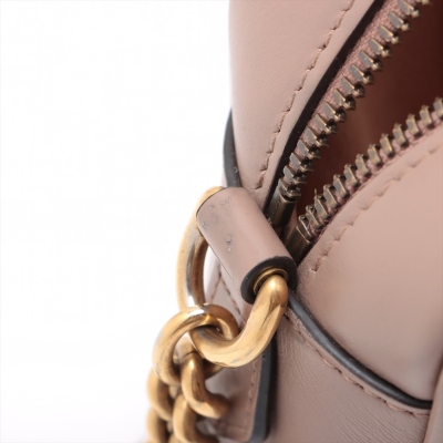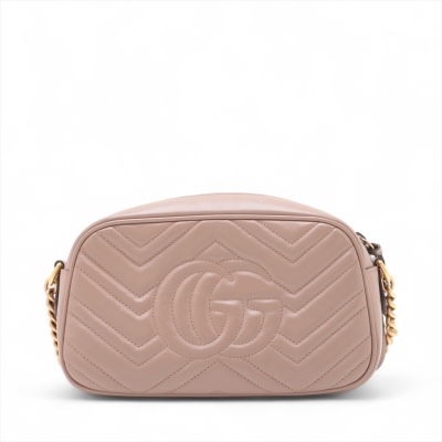 Gucci GG Marmont shoulder bag in powder pink chevron quilted leather. Featuring antique gold-toned hardware, double G hardware logo at front, and leather-chain shoulder strap. The zipper top opens to beige microfiber lining interior with a patch pocket. Approximate dimensions: 23.5cm(L) x 13.5cm(H) x 7cm(D), 60cm shoulder drop height. With Entrupy Certificate of Authenticity. (Pre-owned)