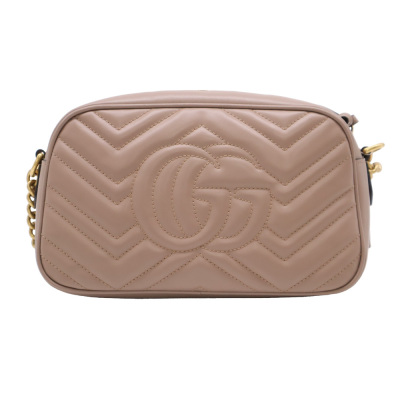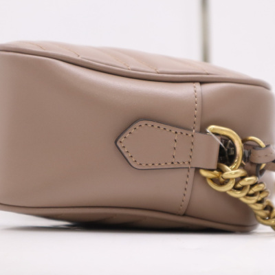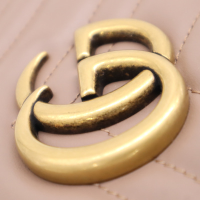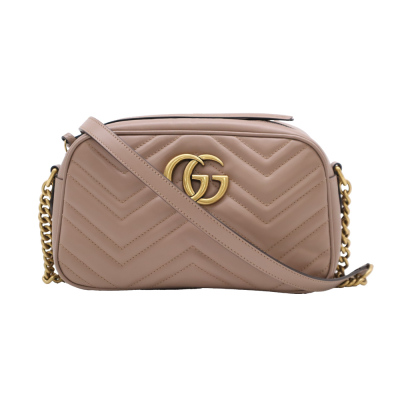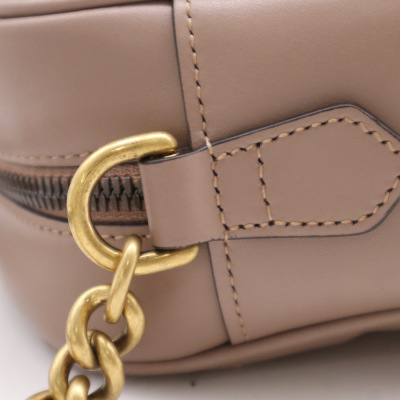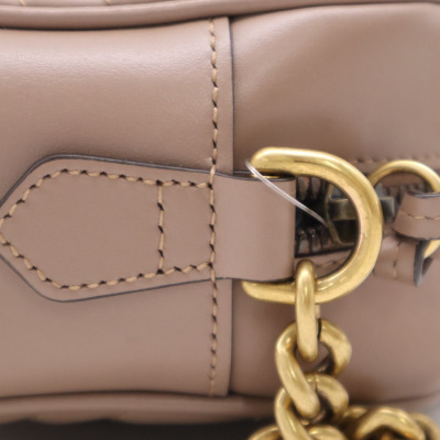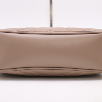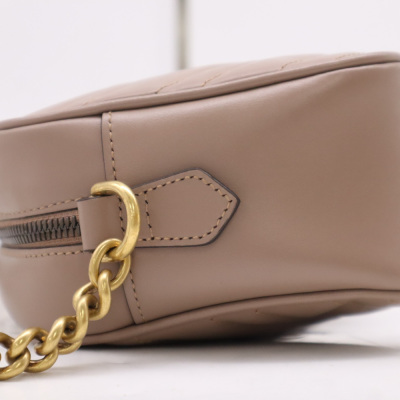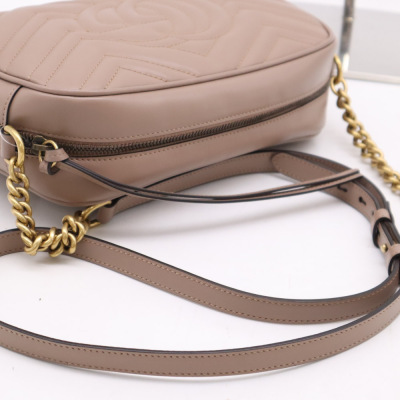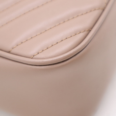 Gucci GG Marmont shoulder bag in beige chevron quilted leather. Featuring antique gold-toned hardware, double G hardware logo at front, and leather-chain shoulder strap. The zipper top opens to beige microfiber lining interior with a patch pocket. Approximate dimensions: 23.5cm(L) x 13.5cm(H) x 7cm(D), 60cm shoulder drop, adjustable. With Entrupy Certificate of Authenticity. (Pre-owned)