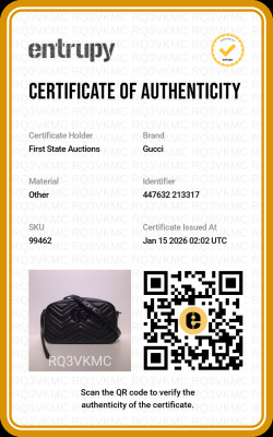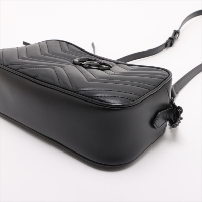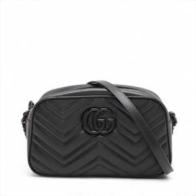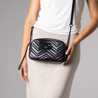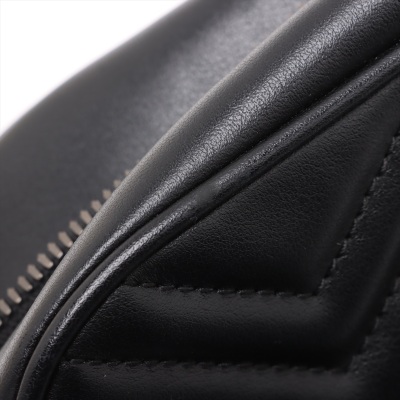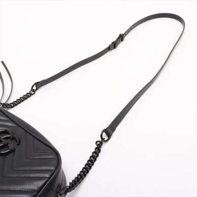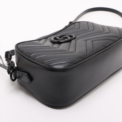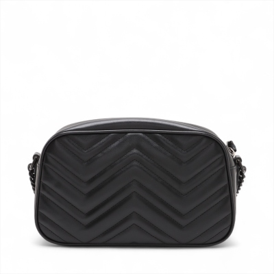 Gucci GG Marmont shoulder bag in black chevron quilted leather. Featuring black-toned hardware, double G hardware logo at front, and a zip top closure. The top opens to a black canvas-lined interior with a leather patch pocket. Approximate dimensions: 24cm(L) x 14cm(H) x 7cm(D), with a 61cm adjustable shoulder drop. Accompanied by a Gucci dustbag and information book. With Entrupy Certificate of Authenticity. (Pre-owned)