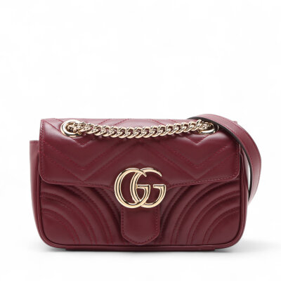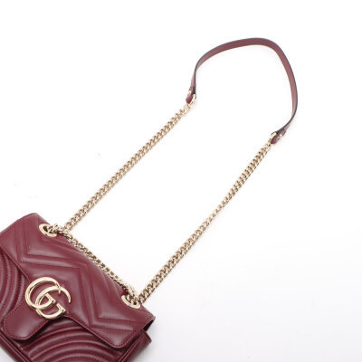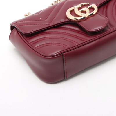 Gucci small GG Marmont shoulder bag in Rosso Ancora red matelassé chevron lambskin. Featuring light gold-toned hardware, sliding chain with leather pad strap, and front flap with interlocking GG logo. The push-lock closure opens to a beige leather interior with a slip pocket. Approximate dimensions: 22cm(W) x 14cm(H) x 5.5cm(D), with a 55cm strap drop. Accompanied by a Gucci dustbag and box. With Entrupy Certificate of Authenticity.