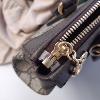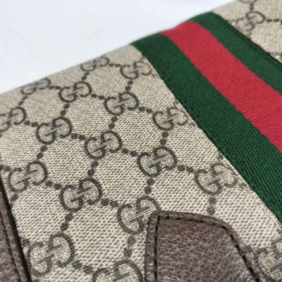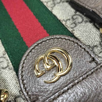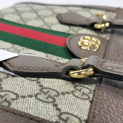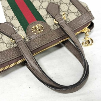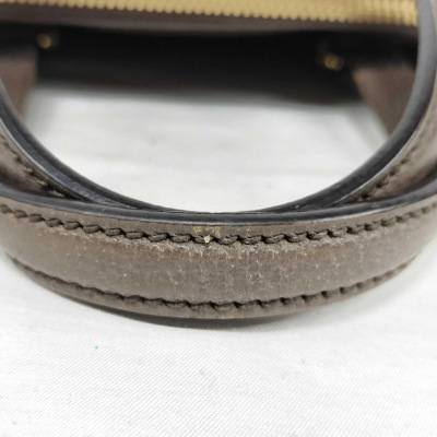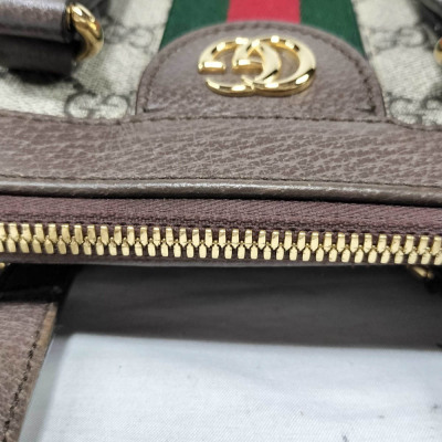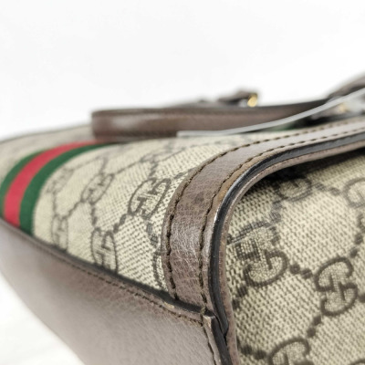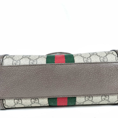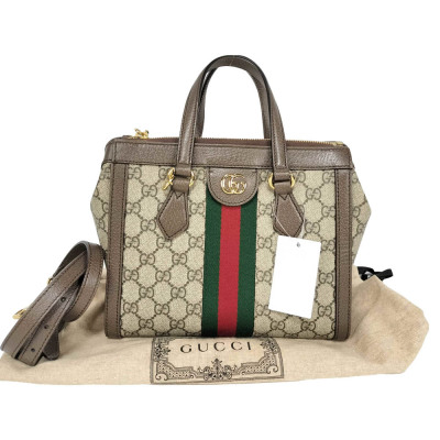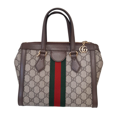 Gucci GG small Ophidia Web bag in GG supreme canvas and with brown leather trims. Featuring gold-toned hardware, dual top flat handles, interlocking GG logo at front, and red and blue web stripe detail. The zipper top opens to a beige microfibre interior with a patch pocket. Approximate dimensions: 24cm(L) x 19cm(H) x 10.5cm(D), handle drop 10cm, shoulder strap drop 64cm, adjustable. Accompanied by Gucci dustbag. With Entrupy Certificate of Authenticity. (Pre-owned)