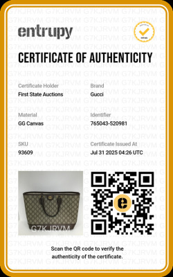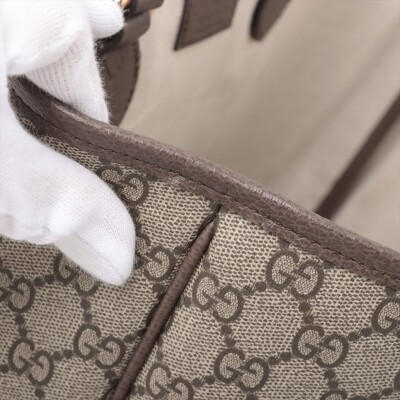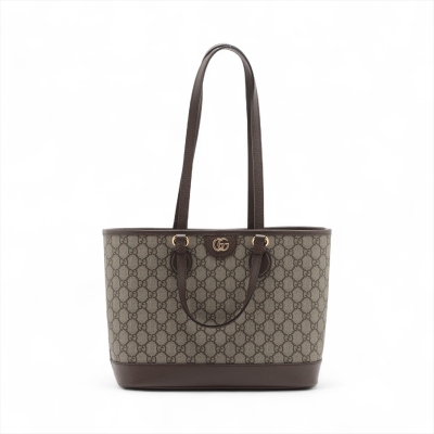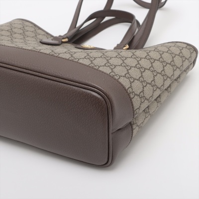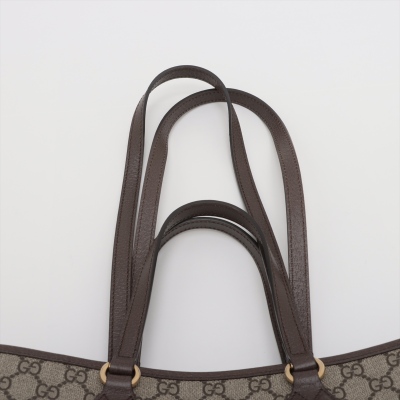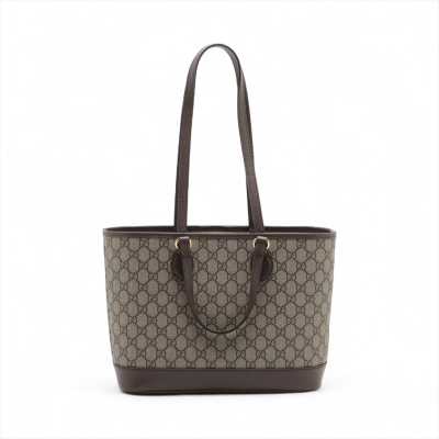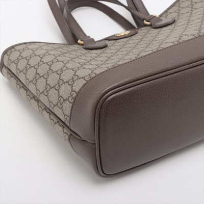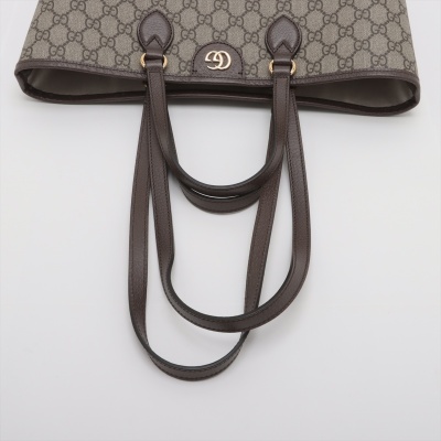 Gucci GG Ophidia tote in GG Supreme canvas and brown leather trim. Featuring gold-toned hardware, and short & tall flat leather handles. The top opens to a beige textile interior with a leather bottom. Approximate dimensions: 30cm(L) x 25cm(H) x 12cm(D), handle drop 13cm, strap drop 27cm. Accompanied by Gucci dustbag. With Entrupy Certificate of Authenticity. (Pre-owned)