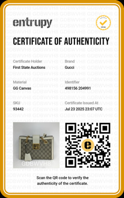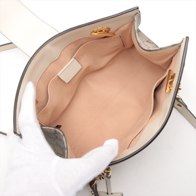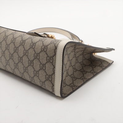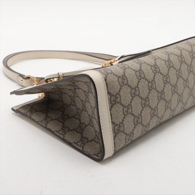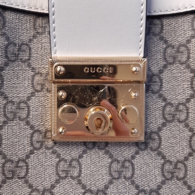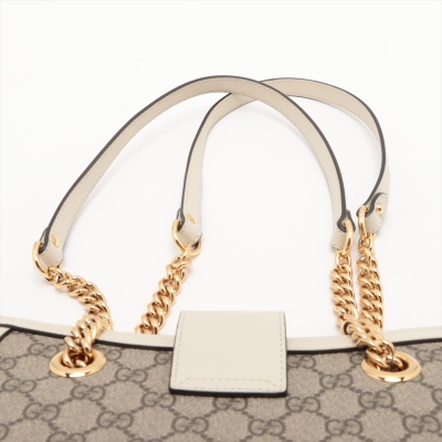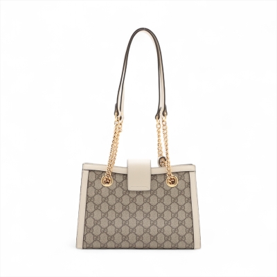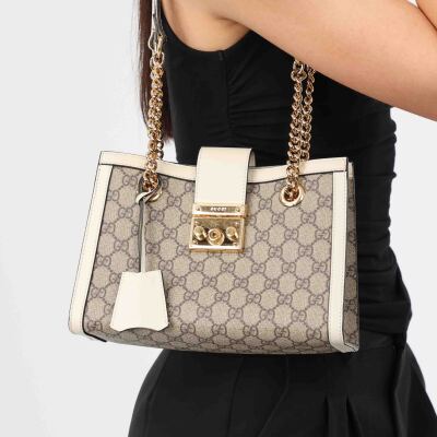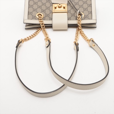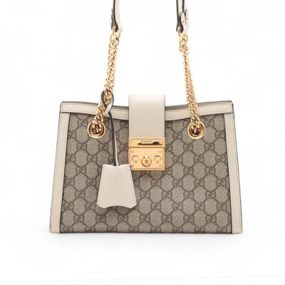 Gucci small Padlock shoulder bag in GG Supreme coated canvas and white leather trim. Featuring gold-toned hardware, double sliding chain straps with leather shoulder pads, and flip-over wide strap with push-lock padlock closure. This opens to a beige microfibre interior with patch pockets. Approximate dimensions: 26cm(L) x 18cm(H) x 10cm(D), handle drop 28cm. Accompanied by Gucci dustbag. With Entrupy Certificate of Authenticity. (Pre-owned)