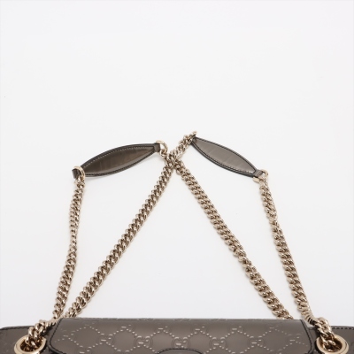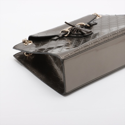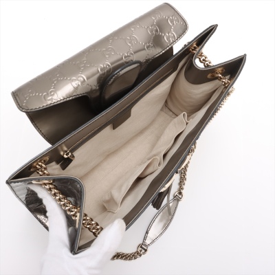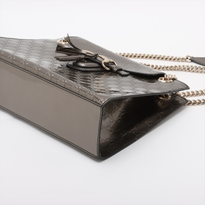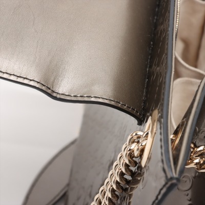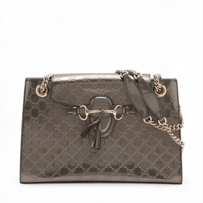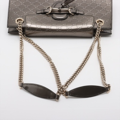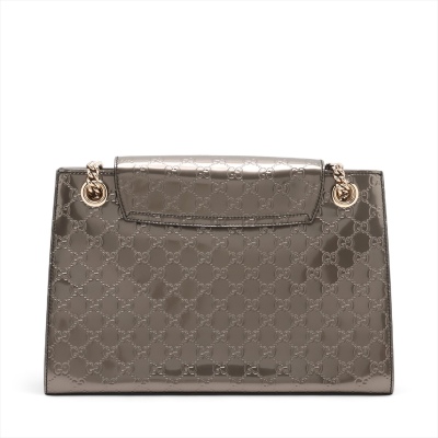 Gucci Guccissima large Emily chain bag in gold patent leather with GG pattern embossed. Featuring light gold-toned hardware, the signature 'Horsebit' embellishment that secures the front flap and the sliding chain link strap with leather pad in the centre. The flap opens to a cream textile interior with zip pocket and patched pockets. Approx dimensions: 36(Base-L) x 24cm (W) x 9cm (D), 26cm double chain drop. With Entrupy Certificate of Authenticity. (Pre-owned)