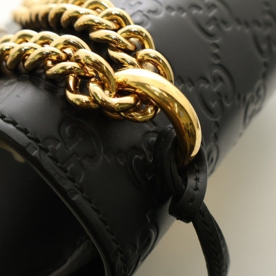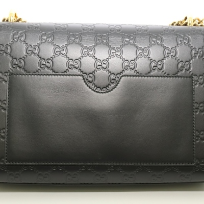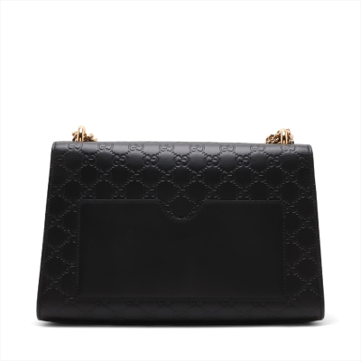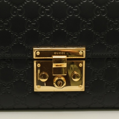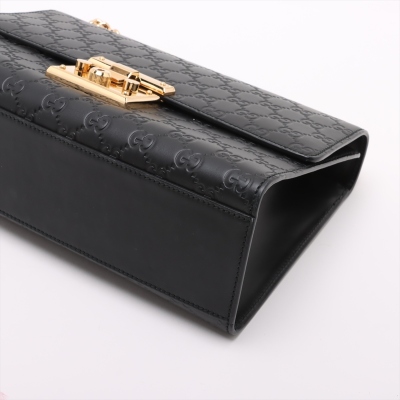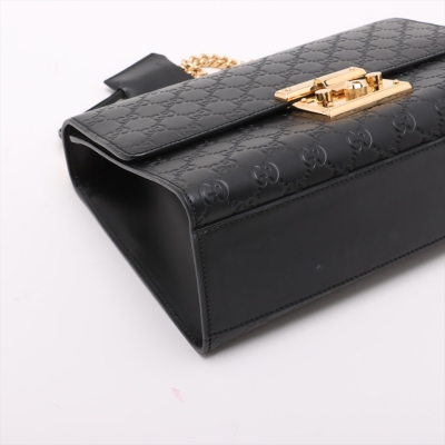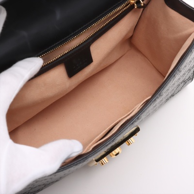 Gucci medium Padlock shoulder bag in black, Guccissima embossed calfskin leather. Featuring gold-toned hardware, a rear flat pocket, and a detachable key clochette. The flap with padlock push-lock closure opens to a beige microfiber lining with a zipper pocket and card slots. Approximate dimensions: 29.5cm(L) x 18.5cm(H) x 10cm(D), sliding chain shoulder strap drop 46cm. Accompanied by a Gucci dustbag. With Entrupy Certificate of Authenticity.