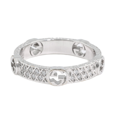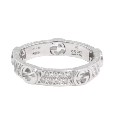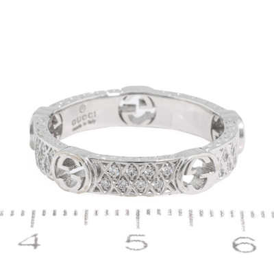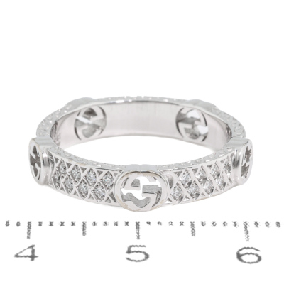 Gucci Interlocking G Diamond ring with 40 round Natural Diamonds totalling approximately 0.20ct. 18ct white gold. Gucci stamped size 15, measures as Australian size: N 1/4 - ring resizing is not recommended. Band width: 3.8mm - 4.1mm. Made in Italy. Weight: 4.7g. With Gucci box and pouch. (Pre-owned)