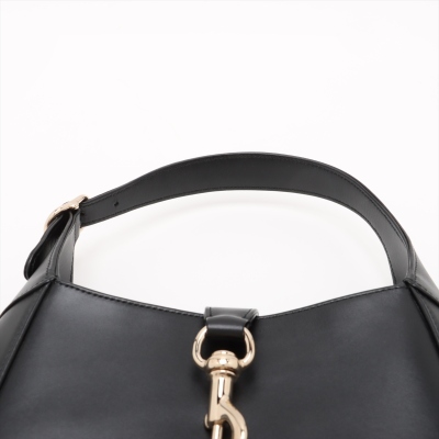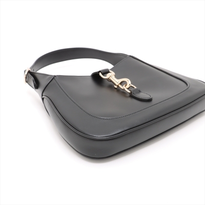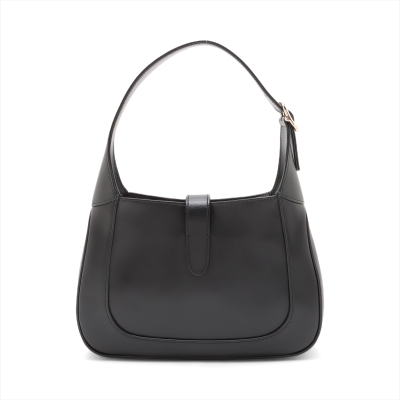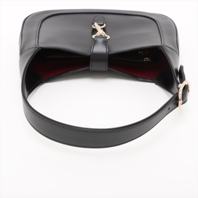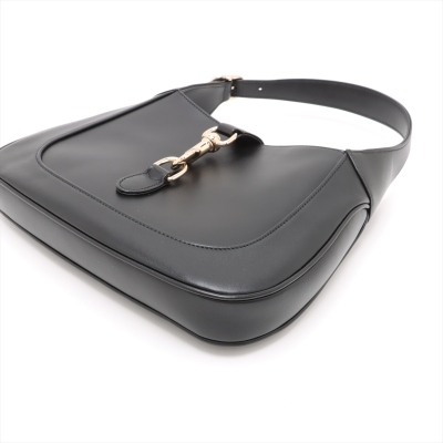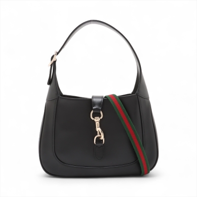 Gucci Jackie 1961 medium bag in black smooth leather. Featuring light gold-toned hardware, crescent shape, a leather handle with green-red web-leather strap extension. The piston closure opens to a burgundy leather lining with zippered and patch pockets. Approximate dimensions: 27.5cm(B-W) x 19cm(H) x 3.5cm(D), with a 17cm handle drop, adjustable. Accompanied by Gucci RFID authenticity card, care card and dustbag. With Entrupy Certificate of Authenticity.