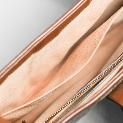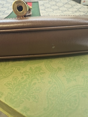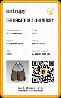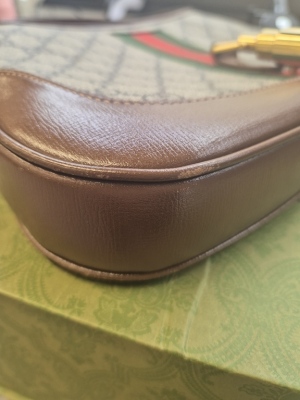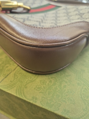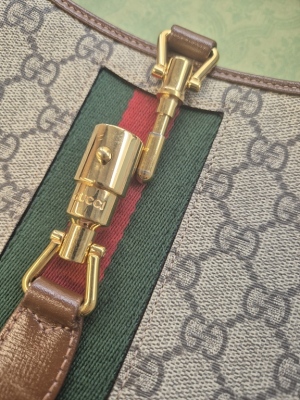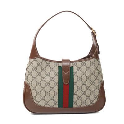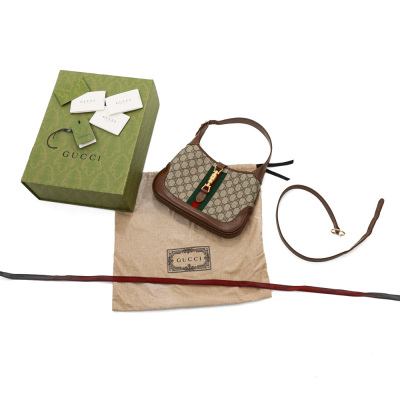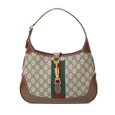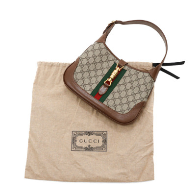 Gucci Jackie 1961 small shoulder bag in beige GG supreme canvas and brown leather trim. Featuring gold-toned hardware, green and red web details at front, and detachable shoulder strap extension. The piston closure opens to a beige suede lining with zipper and patch pockets. Approximate dimensions: 28cm(Base-L) x 19cm(H) x 4cm(D), 20cm handle drop, max strap with extension drop 57cm. Accompanied by Gucci dustbag & box. With Entrupy Certificate of Authenticity. (Pre-owned)