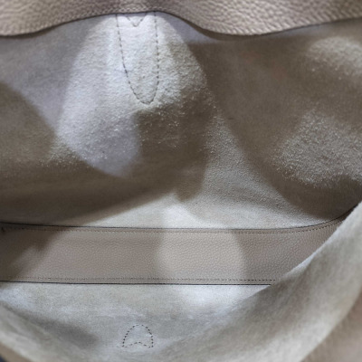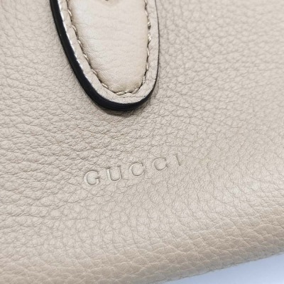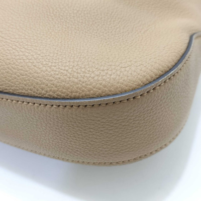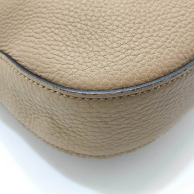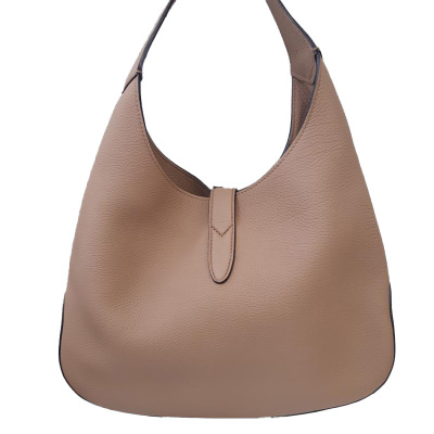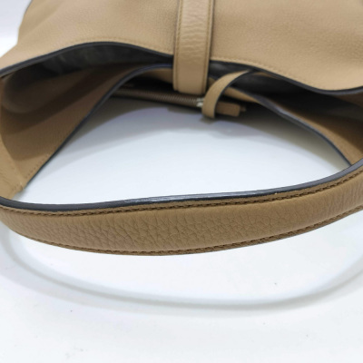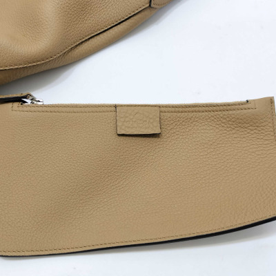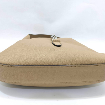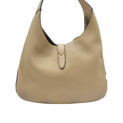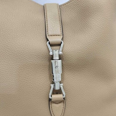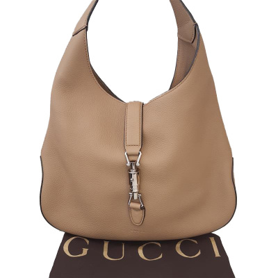 Gucci Jackie soft hobo in light brown grained calfskin. Featuring silver-tone hardware, a piston push-lock closure, and a single curved top handle. The top opens to a beige suede interior with an attached zipper pouch. Approximate dimensions: 30cm(W) x 23cm(H) x 4.5cm(D), handle drop 16cm. Accompanied by Gucci dustbag. With Entrupy Certificate of Authenticity. (Pre-owned)