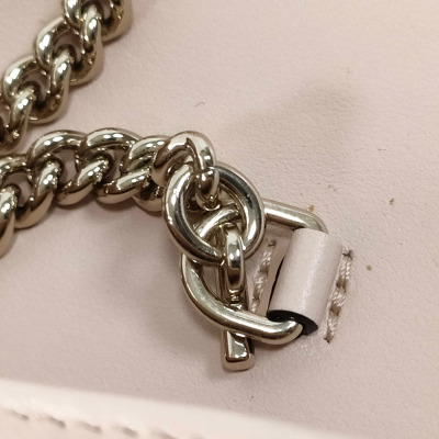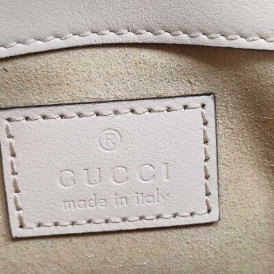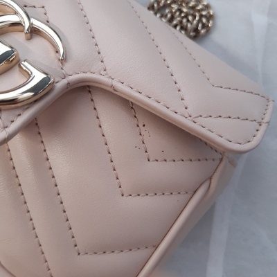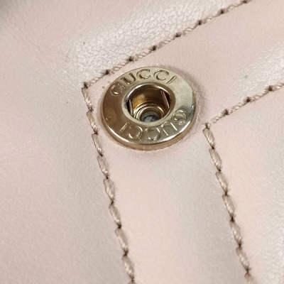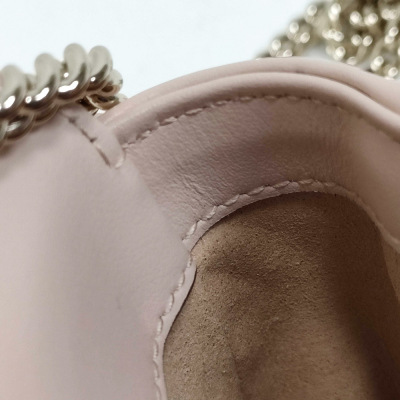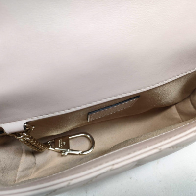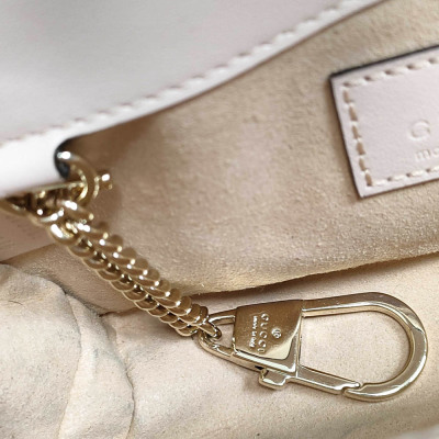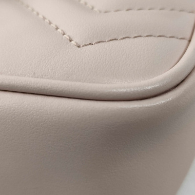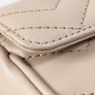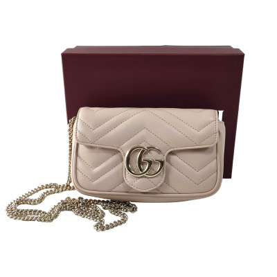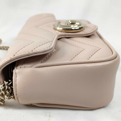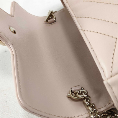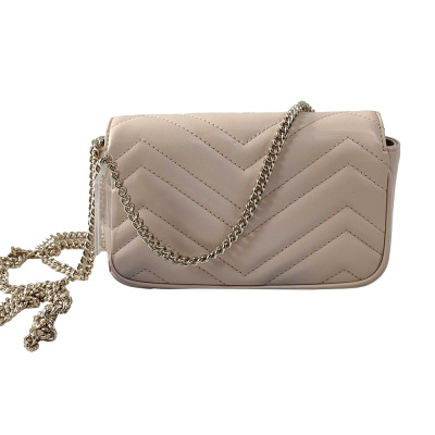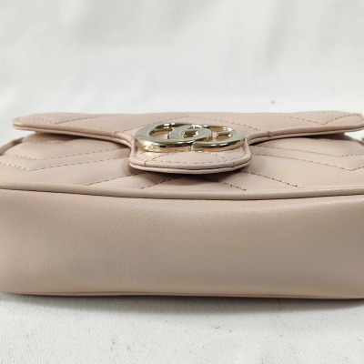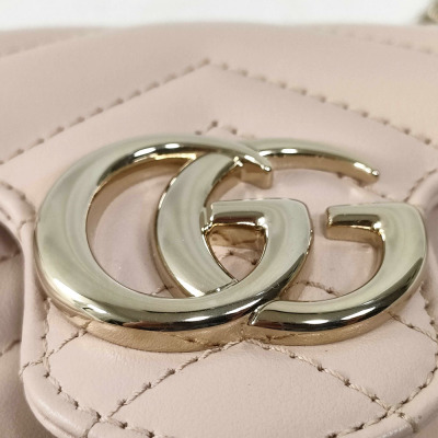 Gucci mini GG Marmont flap shoulder bag in beige chevron quilted leather. Featuring shiny light gold-toned hardware, double GG hardware logo at front, and a chain shoulder strap. The flap with snap button opens to a beige microfibre interior. Approximate dimensions: 17cm(L) x 9cm(H) x 4.5cm(D), shoulder chain drop 58cm, removable. Accompanied by Gucci purchase receipt and box. With Entrupy Certificate of Authenticity. (Pre-owned)