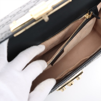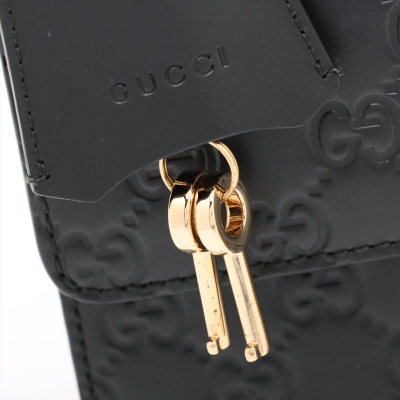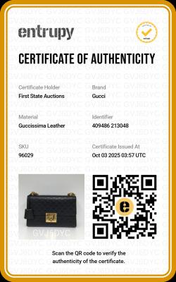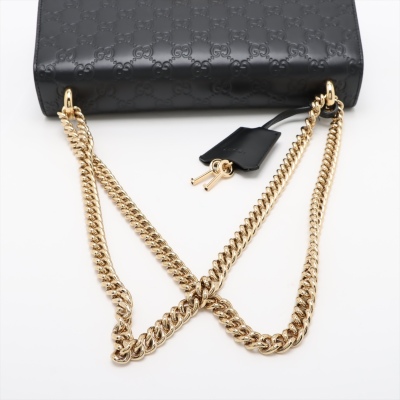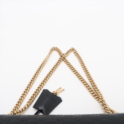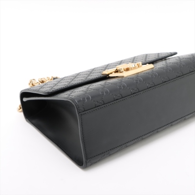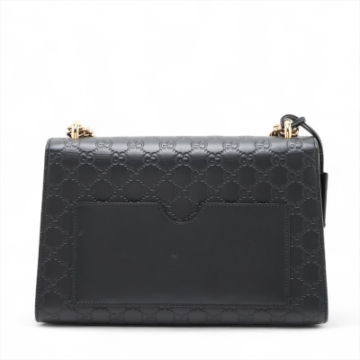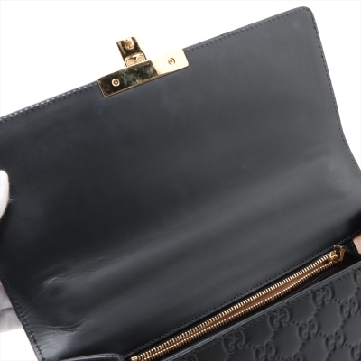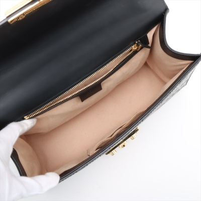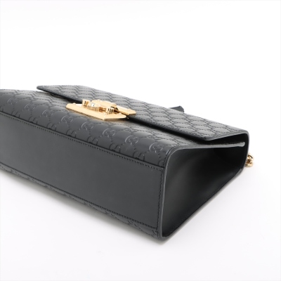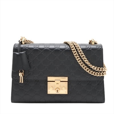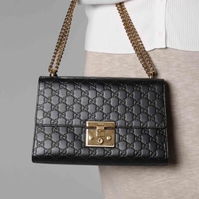 Gucci medium Padlock shoulder bag in black, Guccissima embossed calfskin leather. Featuring gold-toned hardware, a rear flat pocket, and a detachable key clochette. The flap with padlock push-lock closure opens to a beige microfiber lining with a zipper pocket and card slots. Approximate dimensions: 29.5cm(L) x 18.5cm(H) x 10cm(D), chain shoulder strap drop 46cm. Accompanied by keys in leather crochet and Gucci dustbag. With Entrupy Certificate of Authenticity. (Pre-owned)
