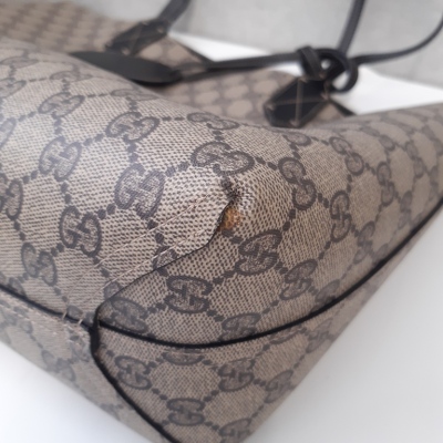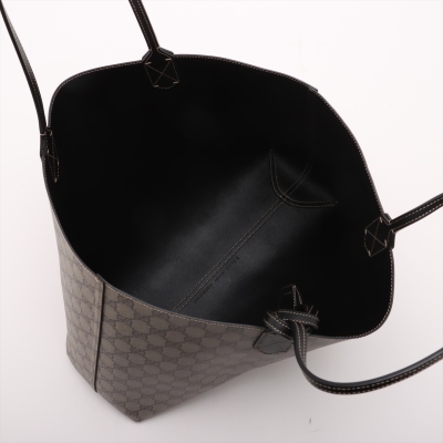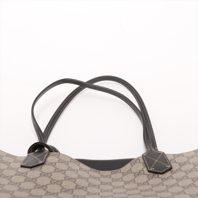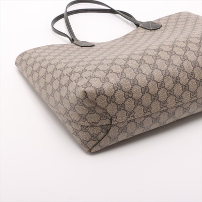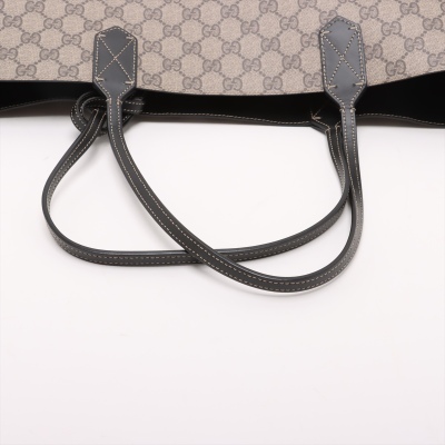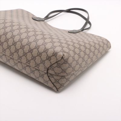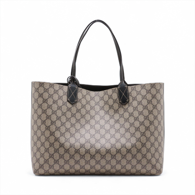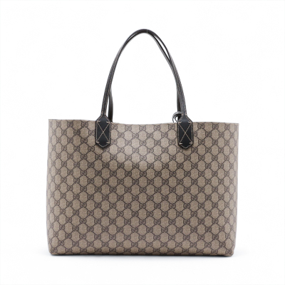 Gucci medium reversible tote bag in GG Supreme canvas. Featuring dual flat top leather handles and detachable name tag clochette. The open top reveals to a black canvas interior that can be reversed to form the exterior. Approximate dimensions: 38cm(Base-W) x 28cm(H) x 12cm(D), handle drop 19cm. Accompanied by Gucci dustbag. With Entrupy Certificate of Authenticity. (Pre-owned)