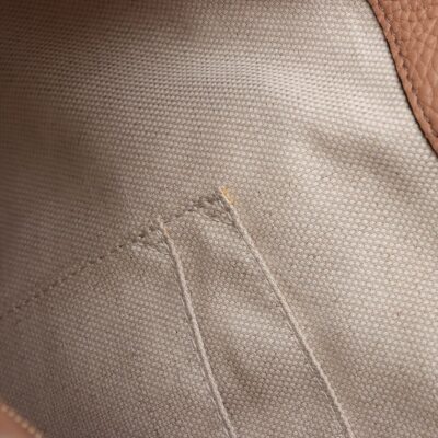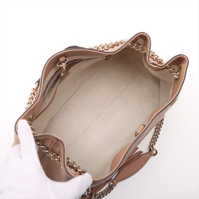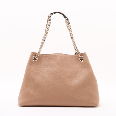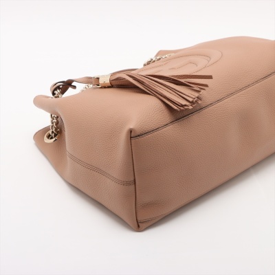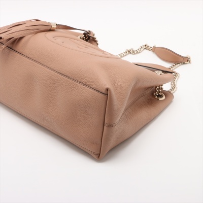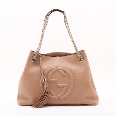 Gucci medium Soho chain tote in tan grained calfskin leather. Featuring a large stitched frontal interlocking GG logo on the front, light gold-tone hardware, a decorative tassel and gold chained straps with leather pads. The top with hook closure opens to a beige textile-lined interior with a zippered pocket and card slots. Approximate dimensions: 38cm(base-W) x 27.5cm(H) x 12cm(D), with a 22cm double strap drop. With Entrupy Certificate of Authenticity.