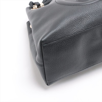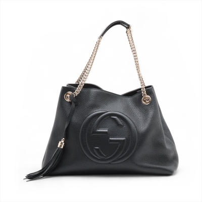 Gucci medium Soho chain tote in black grained calfskin leather. Featuring a large stitched frontal interlocking GG logo on the front, light gold-tone hardware, a decorative tassel and gold chained straps with leather pads. The top with hook-clasp closure opens to a beige textile-lined interior with a zippered pocket and card slots. Approximate dimensions: 38cm(Base-W) x 27.5cm(H) x 12cm(D), with a 22cm double strap drop. Accompanied by a Gucci dustbag. With Entrupy Certificate of Authenticity.