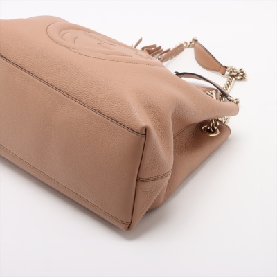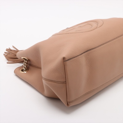 Gucci medium Soho chain tote bag in beige textured calfskin. Featuring a large stitched frontal interlocking GG logo on the front, light gold-tone hardware, a decorative tassel and gold chained straps with leather pads. The top with hook clasp closure opens to a beige fabric lining interior with a zippered and slip pockets. Approximate dimensions: 38cm(Base-W) x 25cm(H) x 14.5cm(D), with a 20cm strap drop. With Entrupy Certificate of Authenticity.