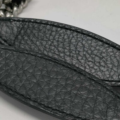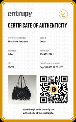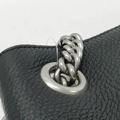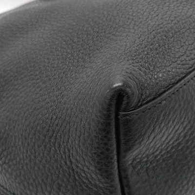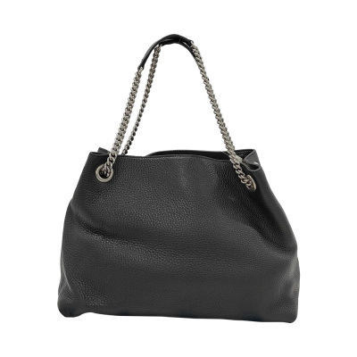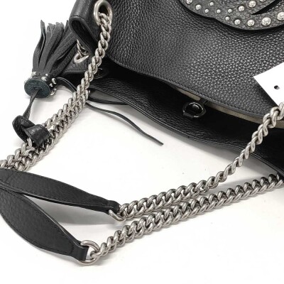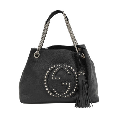 Gucci medium Soho tote bag in black calfskin leather. Featuring silver-toned hardware, embossed interlocking G with studs detail, and detachable leather tassel. The hook closure opens to a beige textile interior with a zipper and patch pockets. Approximate dimensions: 38cm(Base-L) x 27cm(H) x 14cm(D), double chain shoulder strap drop 18cm. With Entrupy Certificate of Authenticity. (Pre-owned)