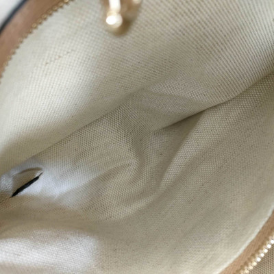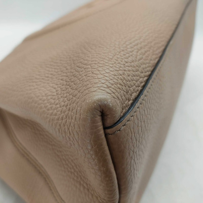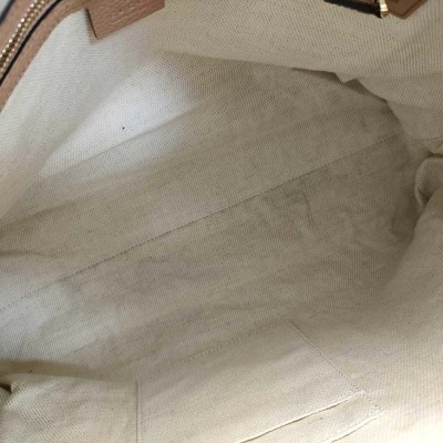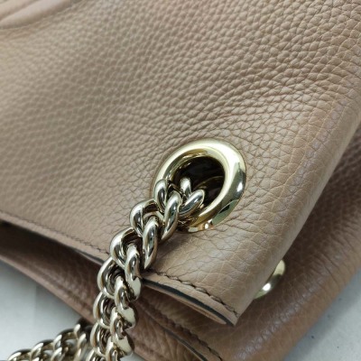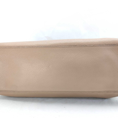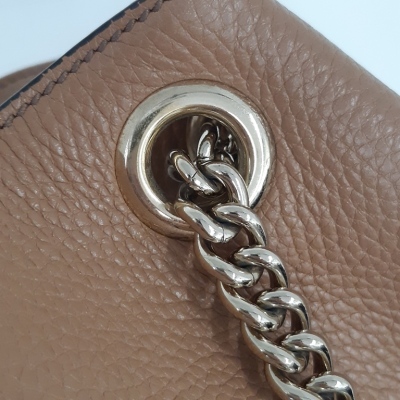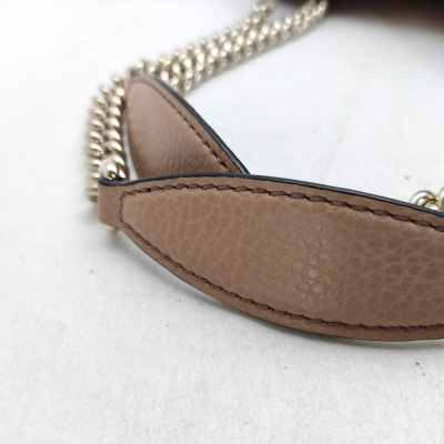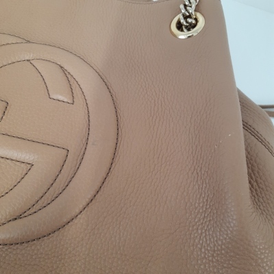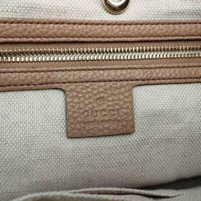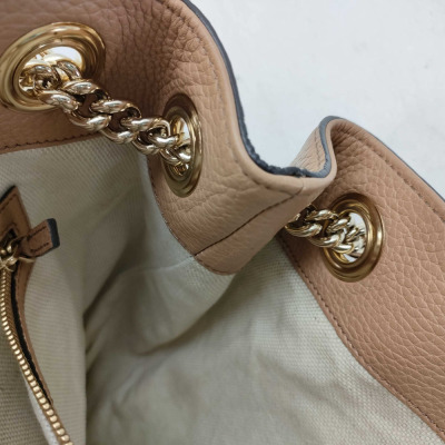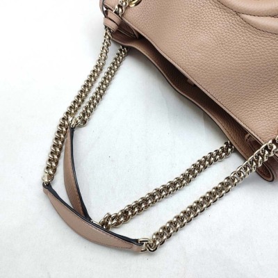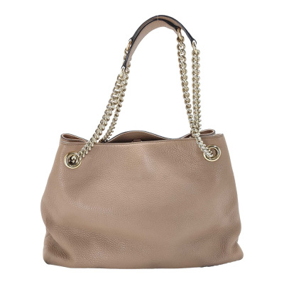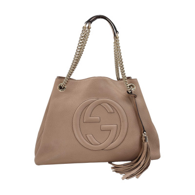 Gucci medium Soho tote bag in beige calfskin leather. Featuring light gold-toned hardware, embossed interlocking G detailing at front, dual chain shoulder straps with leather shoulder pads and a detachable leather tassel. The hook closure opens to a beige textile interior with a zip pocket and patch pockets. Approximate dimensions: 38cm(Base-L) x 27cm(H) x 14cm(D), double chain shoulder strap drop 18cm. With Entrupy Certificate of Authenticity. (Pre-owned)