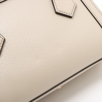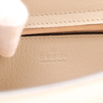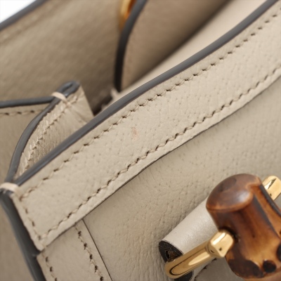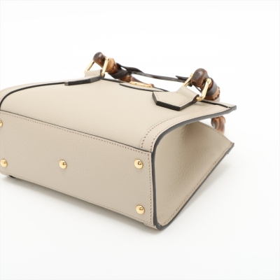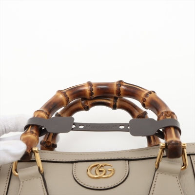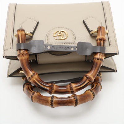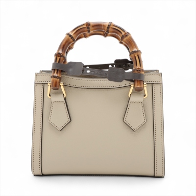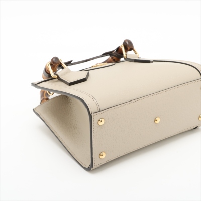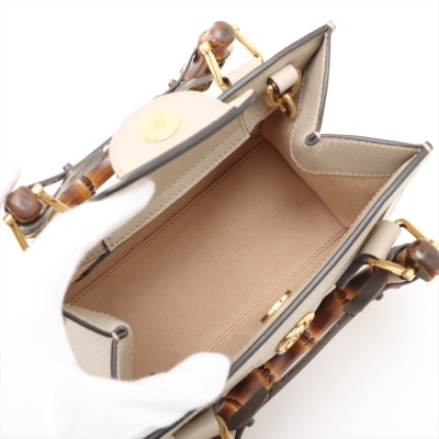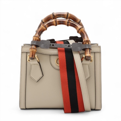 Gucci mini Bamboo Diana in beige grained calfskin. Featuring gold-toned hardware, dual bamboo handles, double G logo at front, open top with magnetic button closure. The top opens to a beige microfibre textile interior with a patch pocket. Approx dimensions: 20cm(L) x 16cm(H) x 10cm(D), handle drop 8cm, shoulder strap 50cm, adjustable. Accompanied by Gucci wide web strap and Gucci dustbag. With Entrupy Certificate of Authenticity. (Pre-owned)