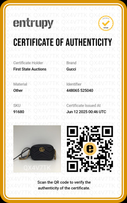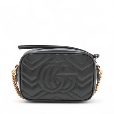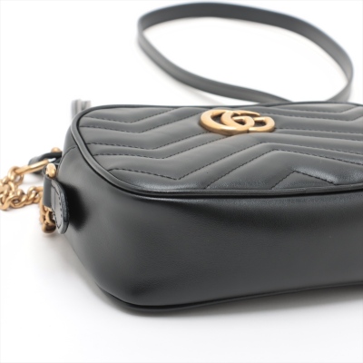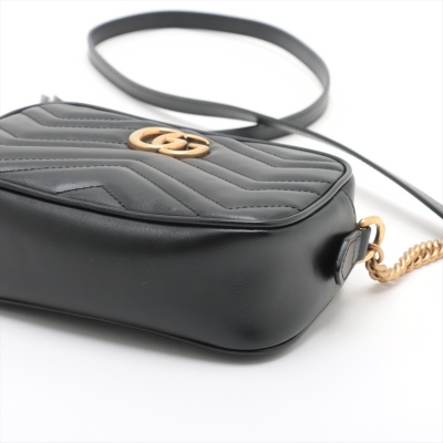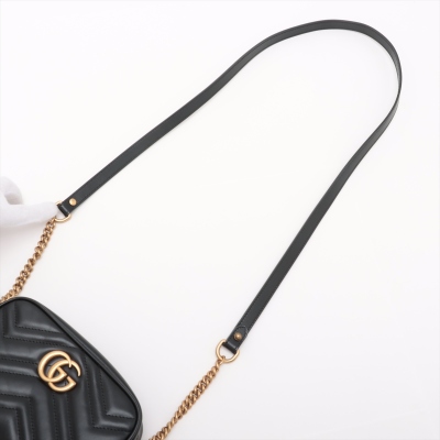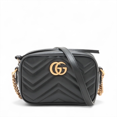 Gucci mini GG Marmont shoulder bag in black chevron quilted leather. Featuring antique gold-toned hardware, double G hardware logo at front, and leather-chain shoulder strap. The zipper top opens to beige microfiber lining interior with a patch pocket. Approximate dimensions: 18cm(L) x 12cm(H) x 6cm(D), 60cm shoulder drop height. Accompanied by a Gucci dustbag. With Entrupy Certificate of Authenticity. (Pre-owned)