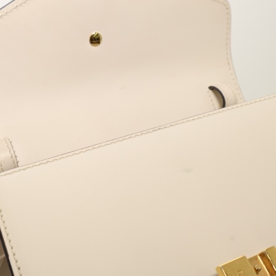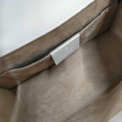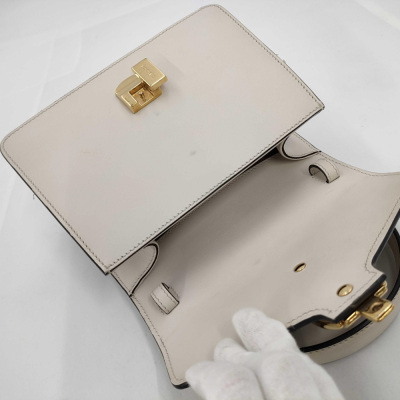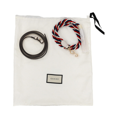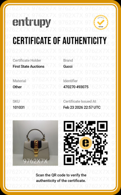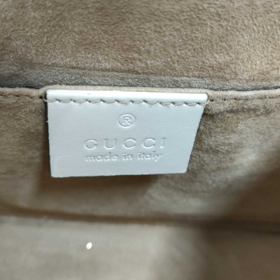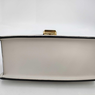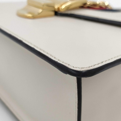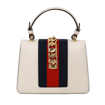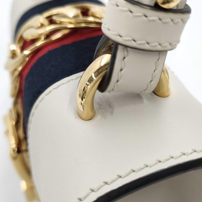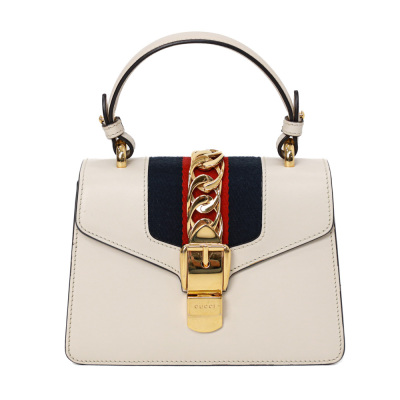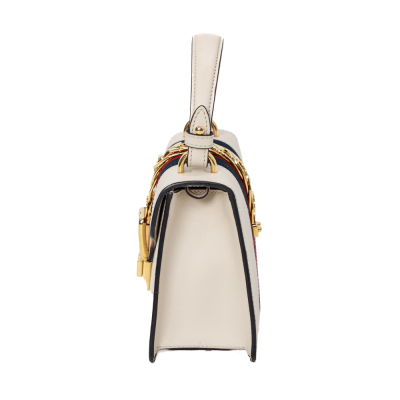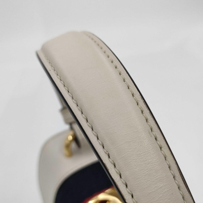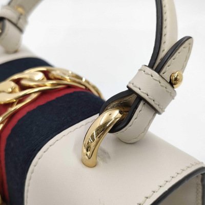 Gucci mini Sylvie handle bag in ivory smooth calfskin leather. Featuring gold-toned hardware, single flat handle, detachable straps and front flap detailed with central red & navy web stripe. The buckle turn-lock closure opens to a taupe microfibre interior with a patch pocket. Approx dimensions: 20cm(base-W) x 14cm(H) x 8cm(D), with a 8.5cm handle drop and 52cm adjustable strap drop. Accompanied by a rope shoulder strap and dustbag. With Entrupy Certificate of Authenticity. (Pre-owned)