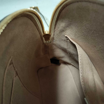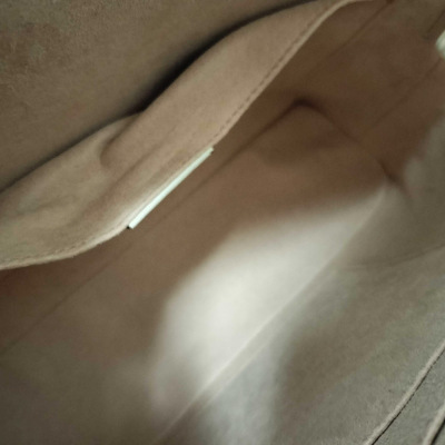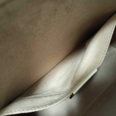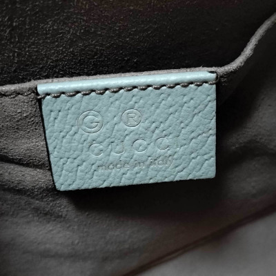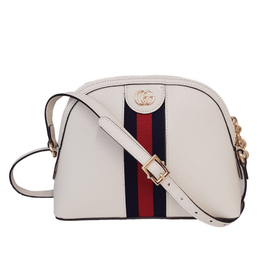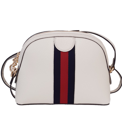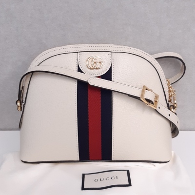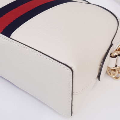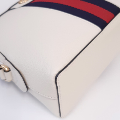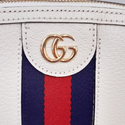 Gucci Ophidia shoulder bag in ivory textured leather. Featuring gold-toned hardware, interlocking GG logo at front, and red and navy blue woven stripe. The 2way zipper closure with GG logo charms opens to a beige microfibre interior with patch pockets. Approximate dimensions: 23cm(L) x 18cm(H) x 7.5cm(D), and adjustable 51cm shoulder strap drop. Accompanied by a Gucci dustbag. With Entrupy Certificate of Authenticity. (Pre-owned)