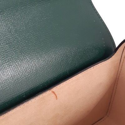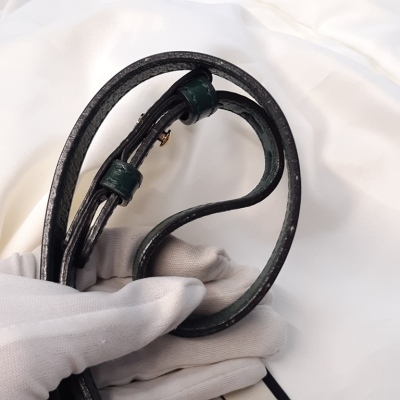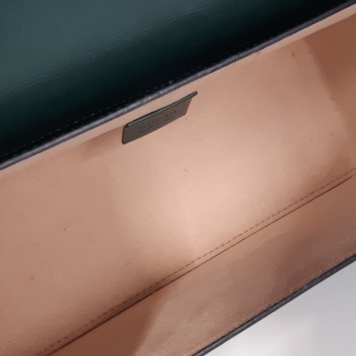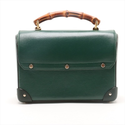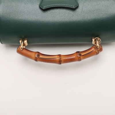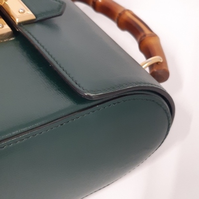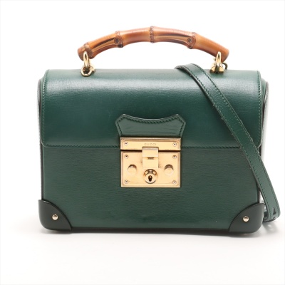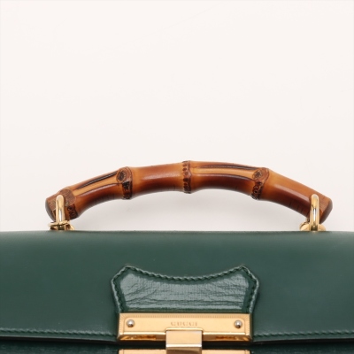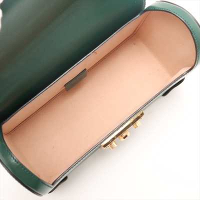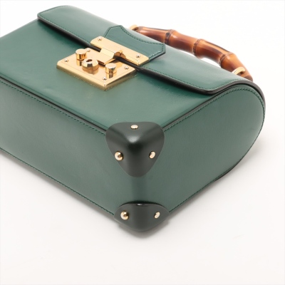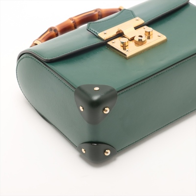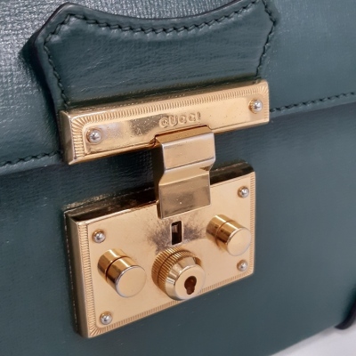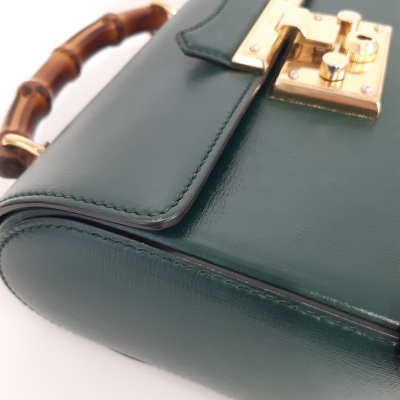 Gucci Padlock bamboo handle shoulder bag in green calfskin. Featuring black leather trims, gold-toned hardware, a single bamboo top handle, and a removable chain-leather shoulder strap. The push-lock closure opens to a beige microfiber-lined interior. Approximate dimensions: 24cm(L) x 17cm(H) x 10cm(D), 3cm handle drop, and 57.5cm shoulder strap drop. Accompanied by a Gucci dustbag. Note: Clochette and keys NOT included. With Entrupy Certificate of Authenticity. (Pre-owned)