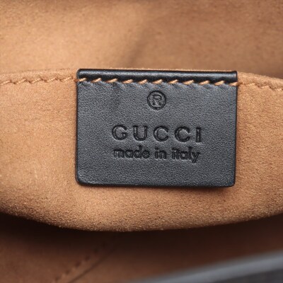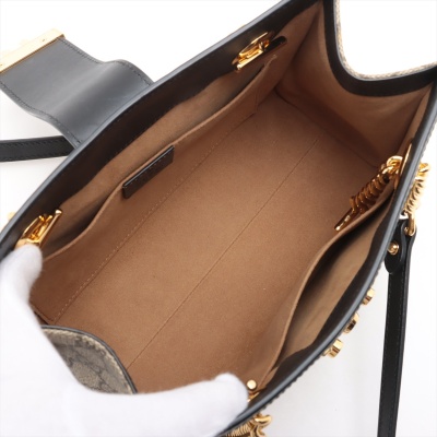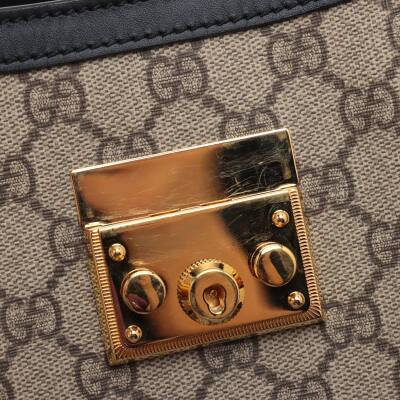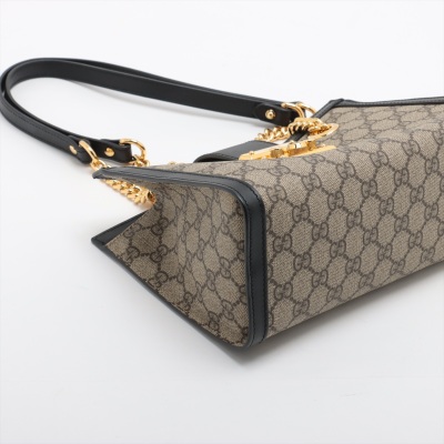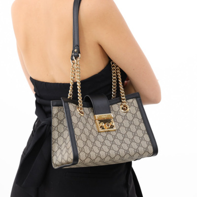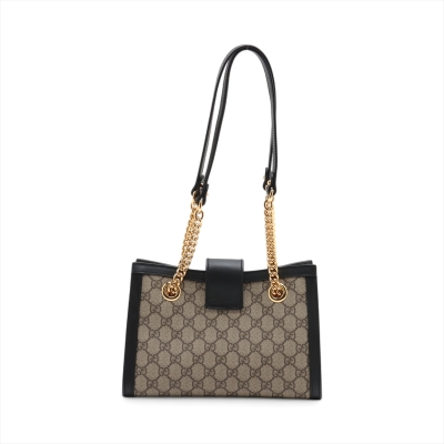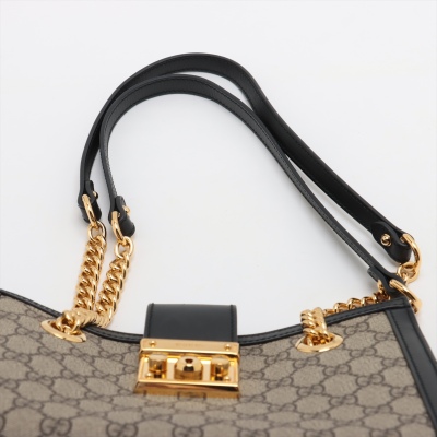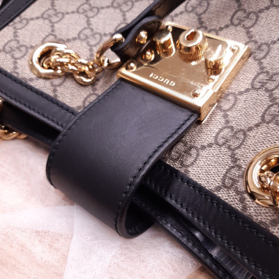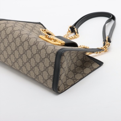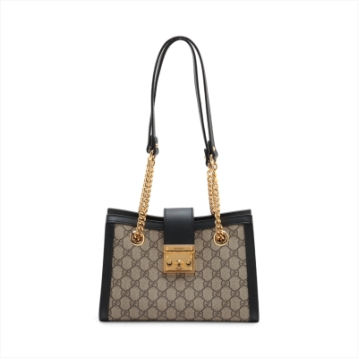 Gucci small Padlock shoulder bag in GG Supreme coated canvas and black leather trim. Featuring gold-toned hardware, double sliding chain straps with leather shoulder pads, and flip-over wide strap with push-lock closure at front. This opens to a brown microfibre interior with patch pockets. Approximate dimensions: 26cm(L) x 18cm(H) x 11cm(D), shoulder drop 29cm. Accompanied by Gucci dustbag, and clochette with keys. With Entrupy Certificate of Authenticity. (Pre-owned)
