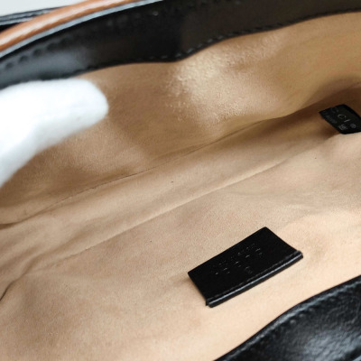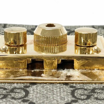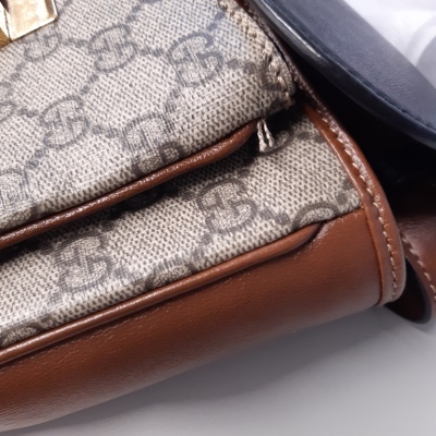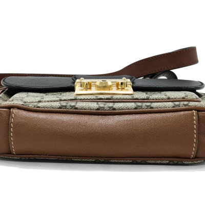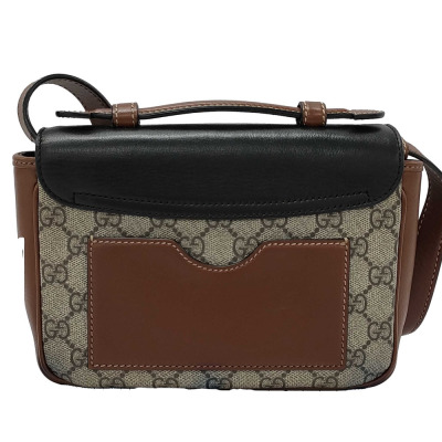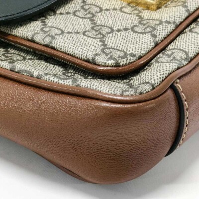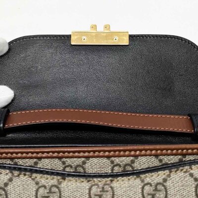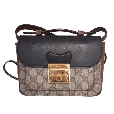 Gucci Padlock shoulder bag in GG Supreme canvas and calfskin leather. Featuring brown leather trim, top handle, and sides, gold-toned hardware, and exterior rear pocket. The push-lock closure on black flap opens to inner patched pocket and beige suede-lined main compartment. Approx. dimensions: 21cm(L) x 15cm(H) x 5cm(D), handle drop 3cm, shoulder strap drop 55cm. Note: leather crochet with keys NOT included. With Entrupy Certificate of Authenticity. (Pre-owned)