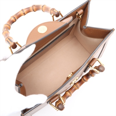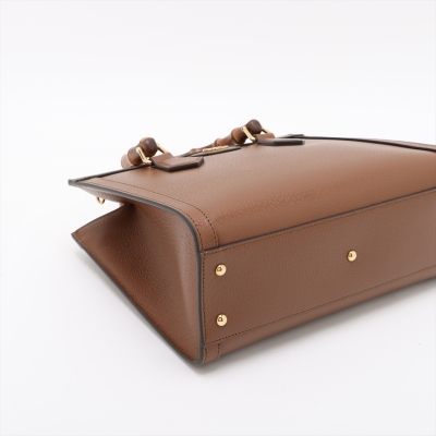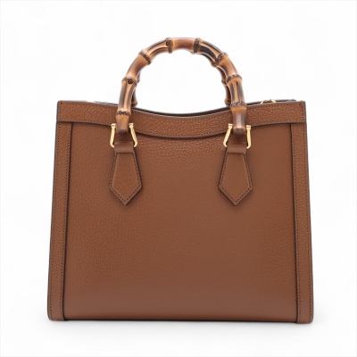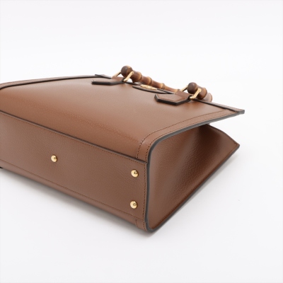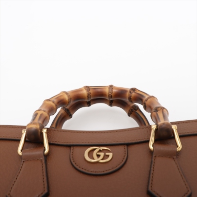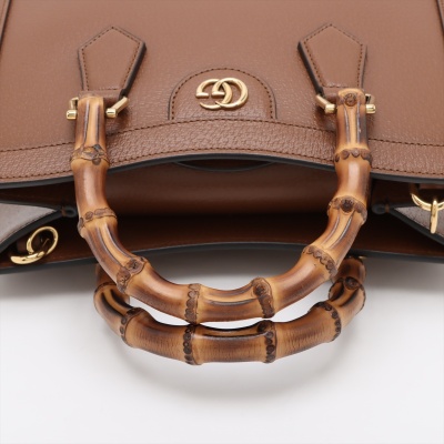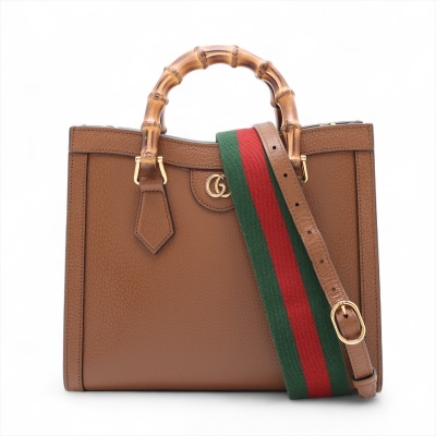 Gucci small Bamboo Diana bag in brown grained leather. Featuring gold-toned hardware, bamboo handles with black decorative belts, double GG logo at front, and magnetic button closure. This opens to a beige microfibre interior with a patch pocket. Approx dimensions: 27cm(L) x 23cm(H) x 11cm(D), handle drop 8.5cm, detachable and adjustable strap drop 55cm. Accompanied by Gucci canvas strap, dustbag & box. With Entrupy Certificate of Authenticity. (Pre-owned)